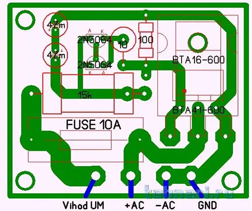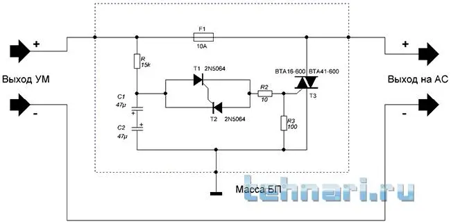 При появлении постоянного напряжения на выходе УМ, симистор закоротит выход усилителя на массу, сгорит предохранитель и обезопасит АС от постоянного напряжения