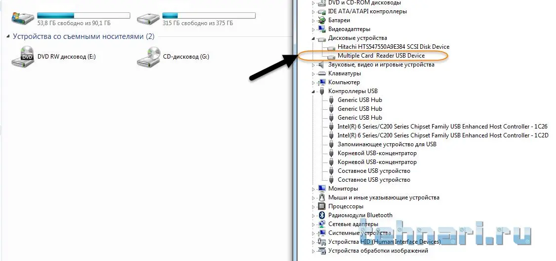 Вставляем карту памяти в разъём кард-ридера, но зайдя в "ярлык" Компьютер Рабочего стола видим