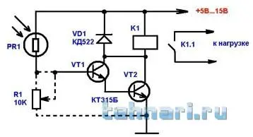 Сопротивление фоторезистора PR1 с увеличением освещенности уменьшается до нескольких КОм (темновое сопротивление несколько МОм), что приведет к открыванию транзистора VT1. Его коллекторный ток откроет транзистор VT2, который включит реле K1, которое своим контактом включит нагрузку.