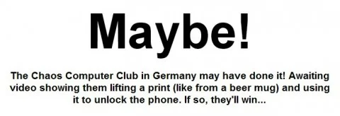 На сайте была только 1 картинка, которая обозначала, что пока Touch ID не взломан. Недавно же, администрация сайта поменяла текст, теперь информация гласит: да, Touch ID взломан.