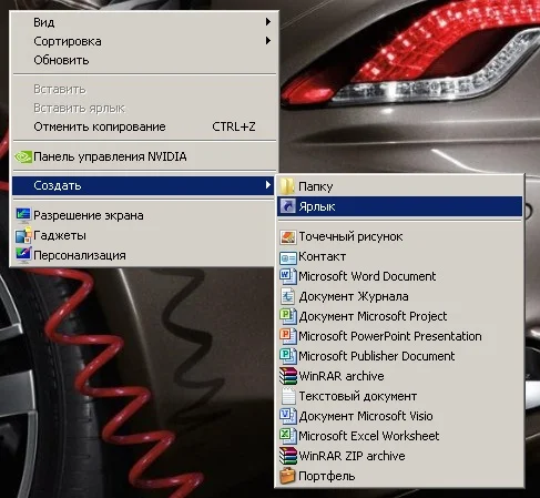 Создаем ярлык на рабочем столе "ПКМ/Создать/Ярлык".