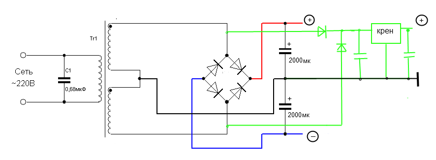 А тут я померил и получается если на каждой оботке по 25 вольт, то при подключ. к ним, а не к 1 обмотке и средней точке получится на стабик аж 50 вольт, а на него( 7805 или крена) можно вроде до 30 вольт подать. Может надо подкл. к 1обмотке и средней точке?Вы схему проверяли? Или я такой тупой:)