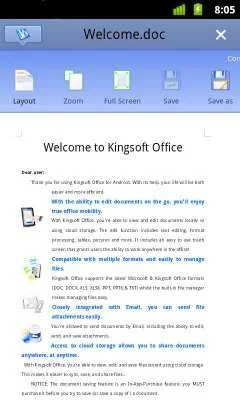 Kingsoft Office - просмоторщик файлов MS office. Открывает такие форматы как doc, docx, xlx, xlxs, ppt, pptx, возможна работа через встроенный файловый менеджер, в наличии интеграция с почтой, то есть можно открывать файлы прямо со своего почтового ящика.
