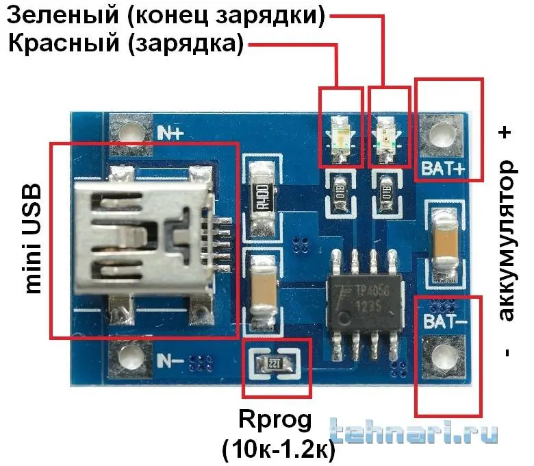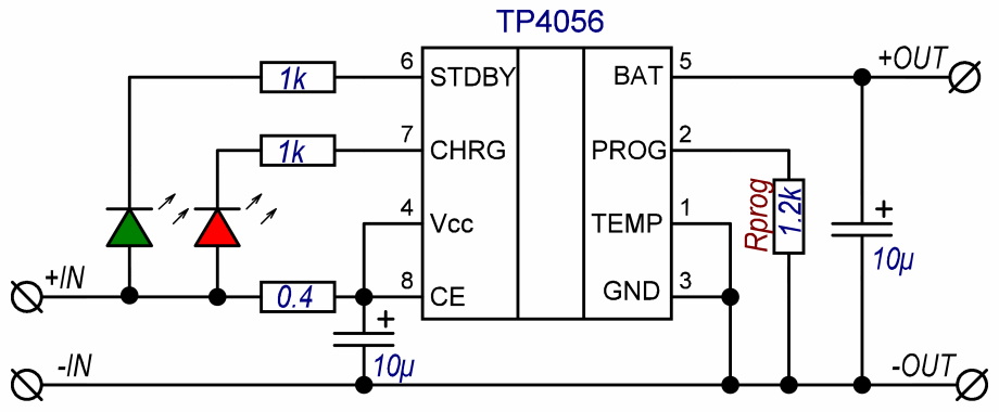 Это ЗУ собрано на TP4056 для литий-ионных аккумуляторов с контролем тока/напряжения. Питание от USB порта или от внешнего напряжения 4 - 8 В. Зарядный ток программируется резистором Rпрог в пределах до 1000мА.