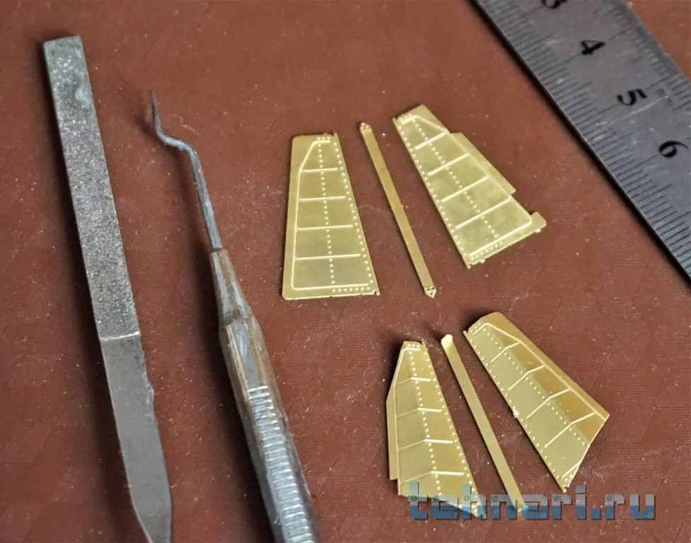 Нижний конус ПО с трубопроводами системы терморегулирования корабля закрыт створками жалюзи, прекрасно выполненными в фотоэчете, прилагаемом к модели. Отделяем детали от платы, зачищаем точки крепления. Чтобы при дальнейшей сборке не перепутать похожие друг на друга детали, необходимо на обратной стороне детали процарапать ее буквенное обозначение. Эта нехитрая операция намного облегчит ваш труд. При помощи гнулки (у кого она есть, я пользуюсь плоскогубцами) произвести гибку створок по осевой линии так, чтобы при установке на корпус ПО между жалюзи остались небольшие просветы.После гибки сворки собираются в комплекты на соединительных планках, а затем красятся. После покраски и сушки необходимо разложить комплекты в порядке, показанном в инструкции по сборке и наклеить их через соединительные планки на корпус ПО.