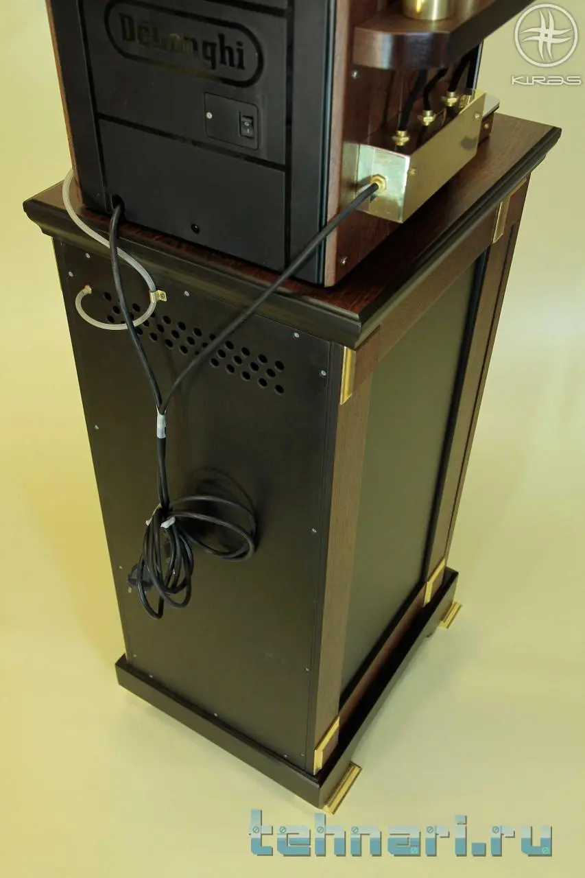 В лучших традициях, я занимался всем что сделано из дерева а Валера изготавливал детали из латуни. Долго думали над внешним видом, в результате появился «концепт». Заказчик остался доволен идеей внешнего вида и закрутилась работа. Я изготовил деревянные накладки на кофеварку, Валера их приладил к кофеварке и стал изготавливать латунную часть. Я тем временем стал обдумывать конструкцию тумбочки и внешний вид, что бы была связь с дизайном кофеварки но отличалась в деталях. За основу была взята печка и стилистика соответственно. У заказчика мебель темного цвета, поэтому за основу были взяты материалы красное дерево и темно коричневая эмаль. Латунные детали на тумбочке решено было заменить фрезерованными профилями покрытые сусальной латунью (технология сусального золочения на полимент). Пока я изготавливал тумбочку, Валера тем временем приделал насос к кофеварке и выточил втулку для соединения подводящего воду шлага. Когда я покрасил и собрал тумбочку, втулка была вклеена в задний полик и соединила бутыль с водой с насосом который автоматически накачивает воду в бачок кофеварки. Получился симбиоз кофеварки и тумбочки. Итак результат нашего труда.
