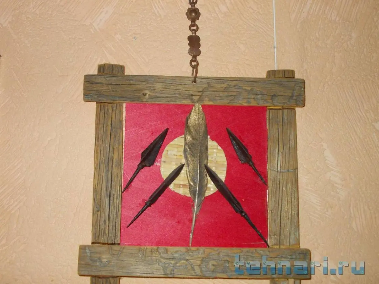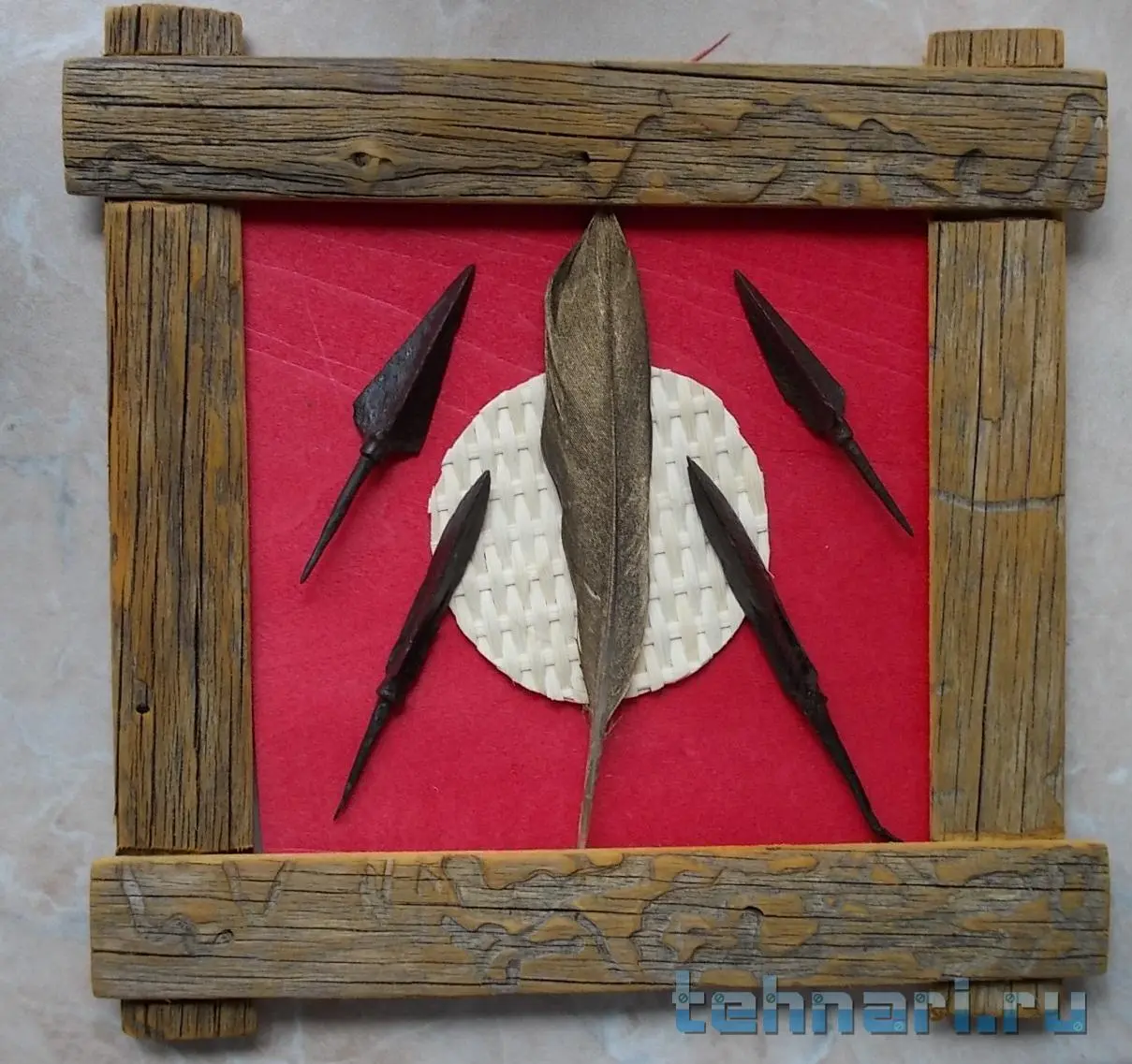 Коллаж "Наки".Использованы наконечники стрел Х11 века новгородцев и половцев .Рамка сделана из доски с червоточинами для подчёркивания старины.Круг в центре(не очень удался) из рогожки,символизирующий древнюю соломенную мишень.Фон из шпона цвета крови.Перо просто вписалось в комплект,а подвес-элемент конского украшения нач.19 века.