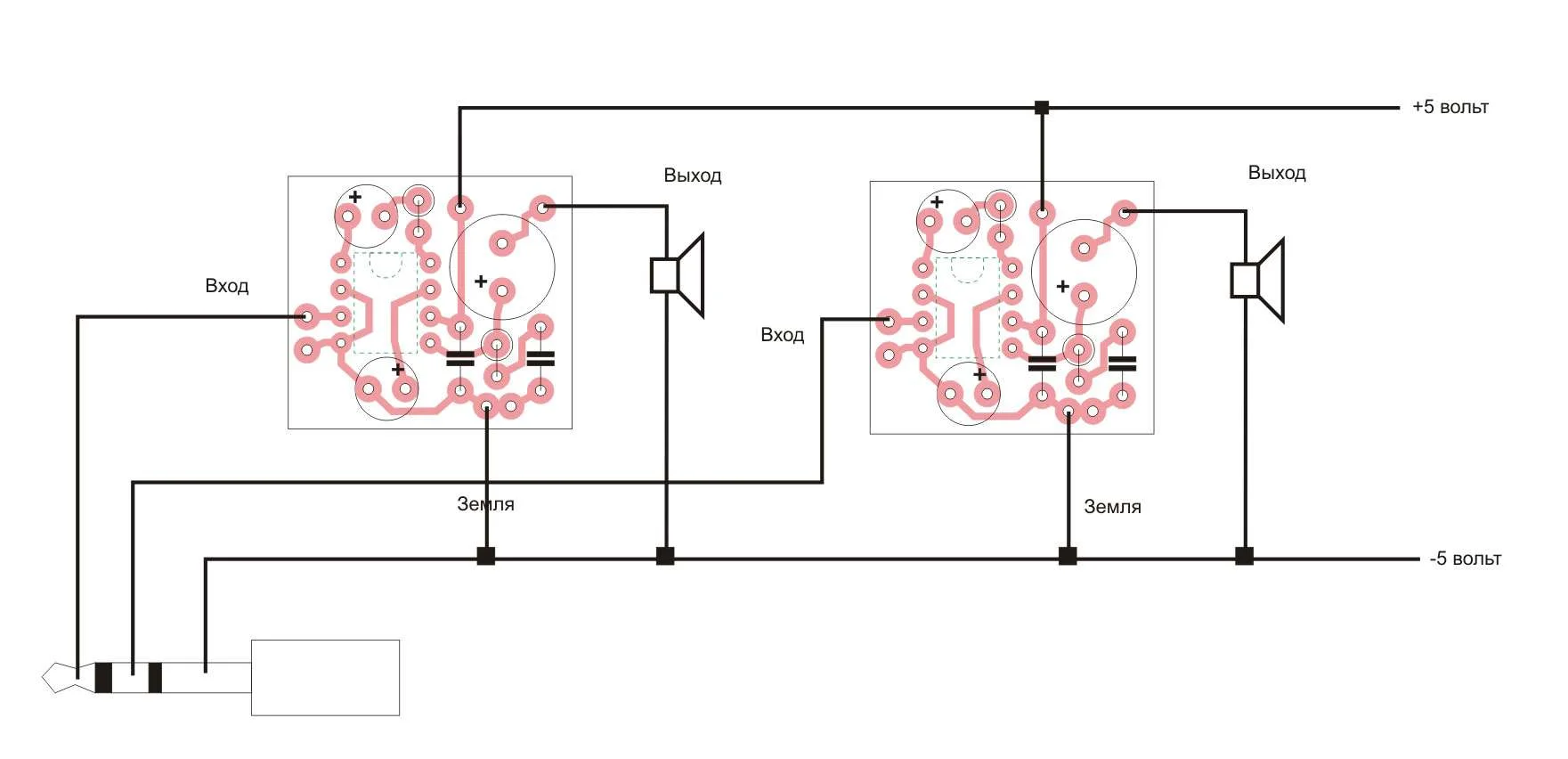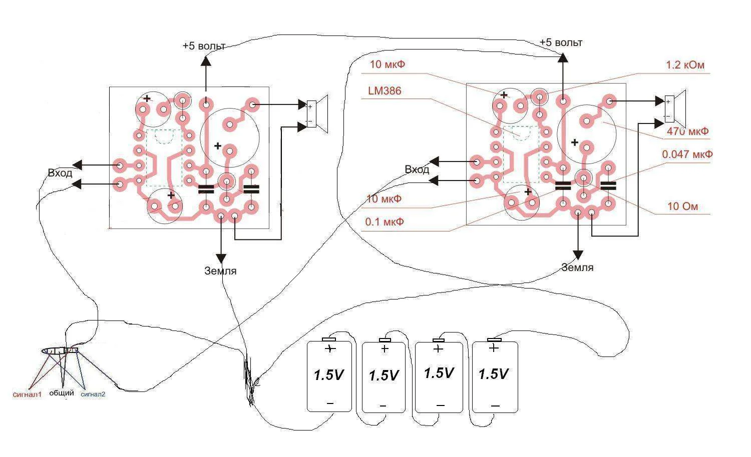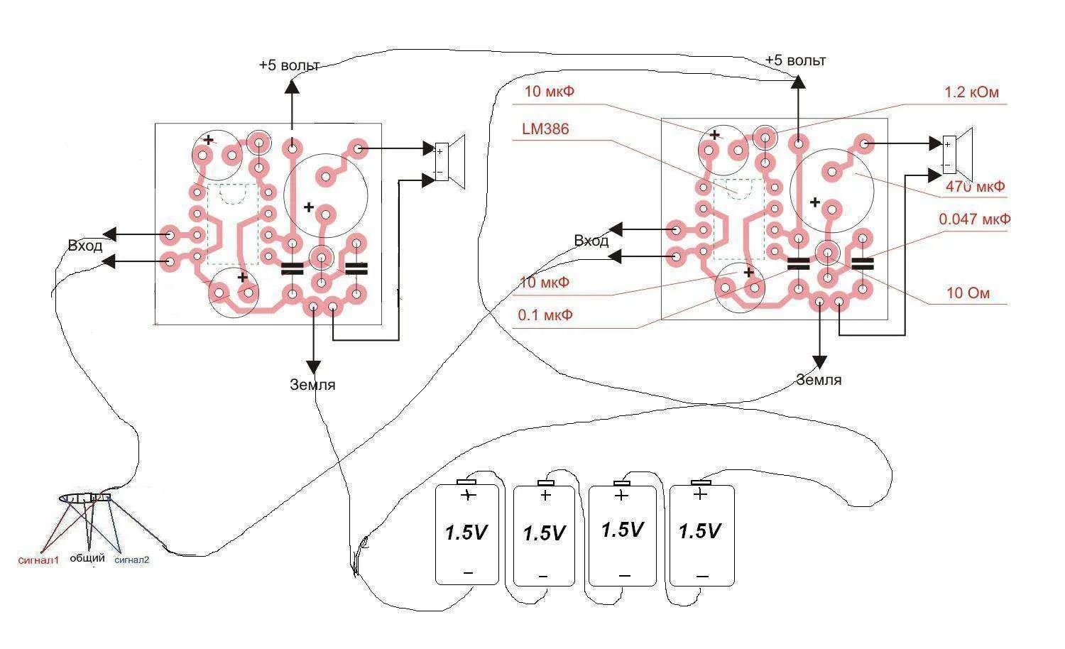Нижний по схеме вывод - это общий, их надо объединить и припаять к общему штекера.