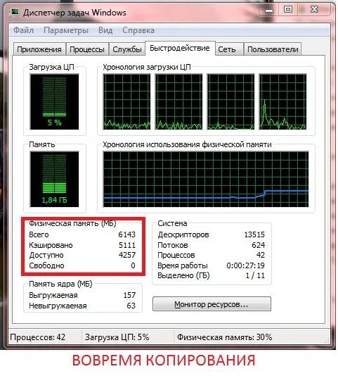 И еще - я заметил в диспетчере задач изменения физической памяти при копировании: вот скрины до копирования и после (ОСОБЕННО ГРАФА "СВОБОДНО" ПУГАЕТ - показатель очень быстро падает к нулю):
