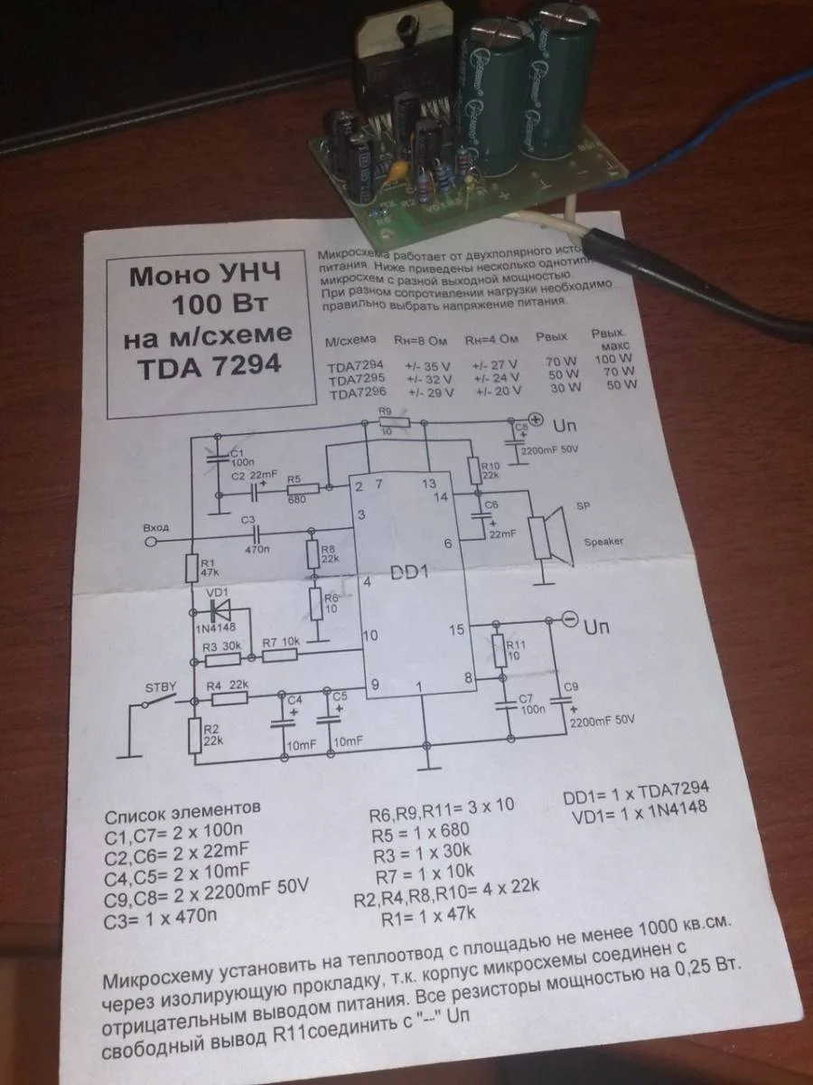 Вобщем купил друг набор тда7294,т.е. сама микруха,обвеска и печатная плата. Ну,собрал он её,подключил к +-26в и она сделала бум. Несмотря на то что никаких замыканий не было,радиатор хорошо изолирован.