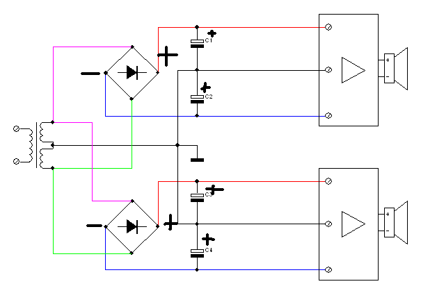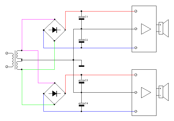 Получается от плюса диодного моста к плюсу конденсатора, и от минуса диодного моста к минусу другого конденсатора?
