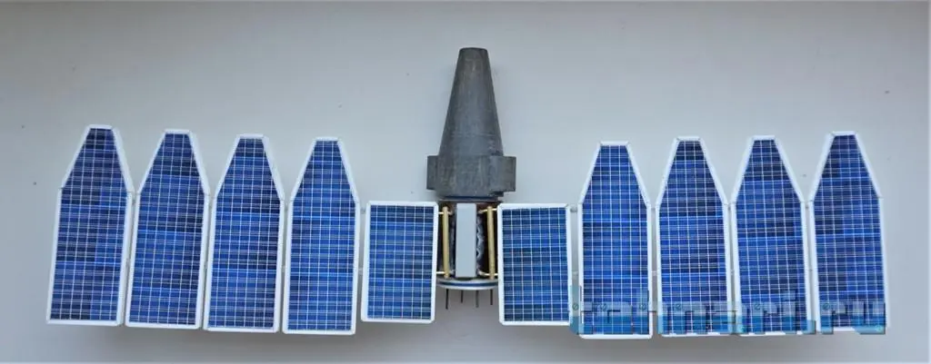 На изготовление панелей солнечных батарей пошел листовой пластик, пластиковый двутавр, пластиковая трубка, проволока, фото с рисунком солнечной панели. Заготовки панелей были нарезаны по размерам с эскиза, оконтурены двутавром, собраны в пакеты на проволочных штифтах. Лицевая сторона украшена фотоизображением с рисунком солнечной панели.