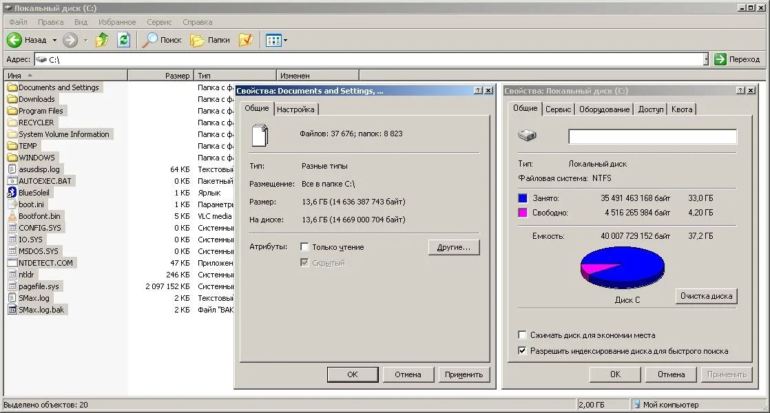 В свойствах диска занятый объём равен 33 гигабайтам, а размер всех файлов (включая скрытые и системные) 13,5 ГБ.
