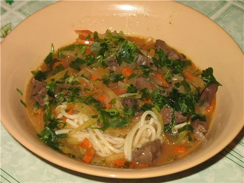 10. Наливаем подливку, затем опять лапшу и заливаем суп подливкой. Если суп получился очень густым, разбавляем его оставшимся бульоном (лично мне нравится более густой вариант).