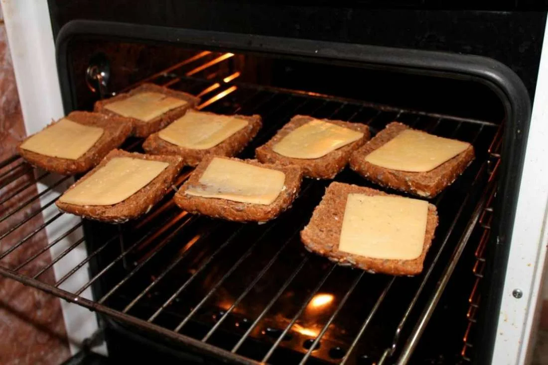 Далее подогреваем до корочки хлебцы, я делал в духовке, но лучше в тостере - быстрее получится. Тут же кладем и плавим сыр.