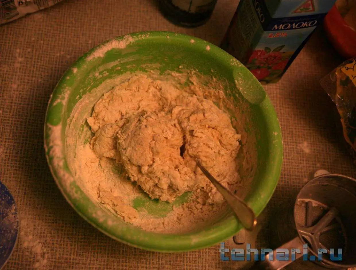 Надо делать тесто. Тут варианта два. Или замешьваешь все в миске, или высыпаешь муку на стол горкой, делаешь ямочку и льешь все в центр, кому как нравится. Мне проще в миске. В миску выливается стакан молока, разбивается два яйца(смотри, разбей сырые!), кладутся дрожжи, а так же не забываем 2 столовые ложки сахара и 0.5 соли. Мешаем, можно миксером.