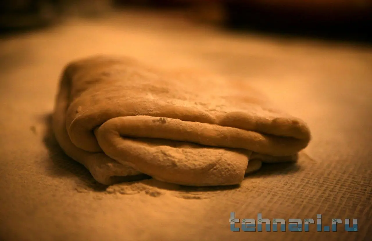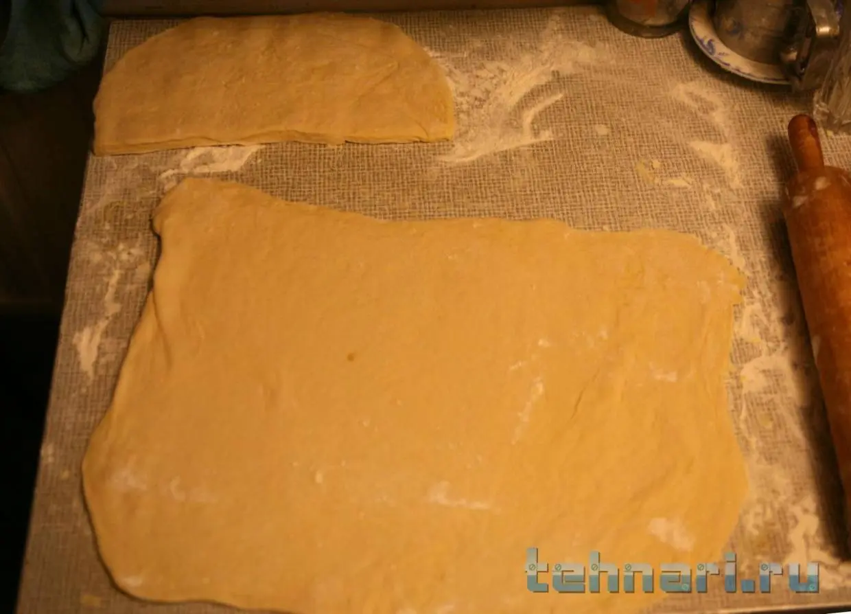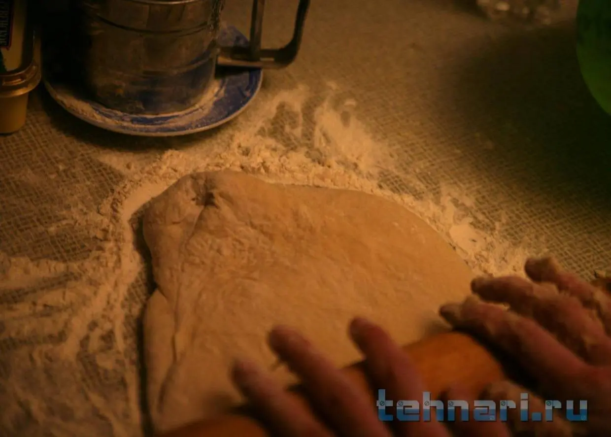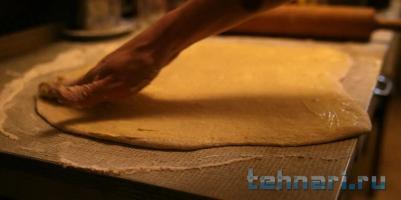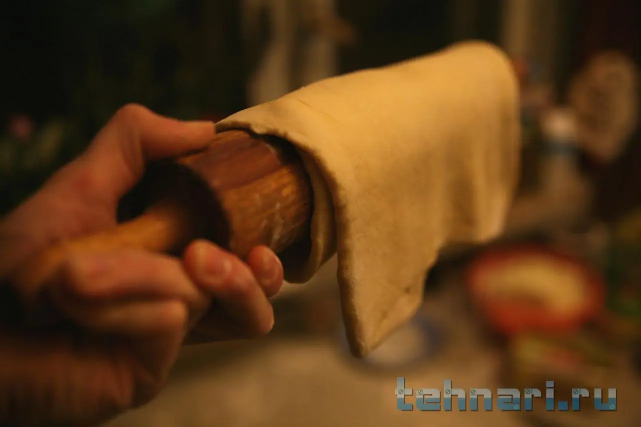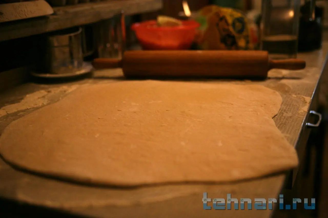 Теперь тесто надо раскатывать, пора расчехлять скалку. Раскатываем до тонкого тонкого, но в меру. Без дырок.