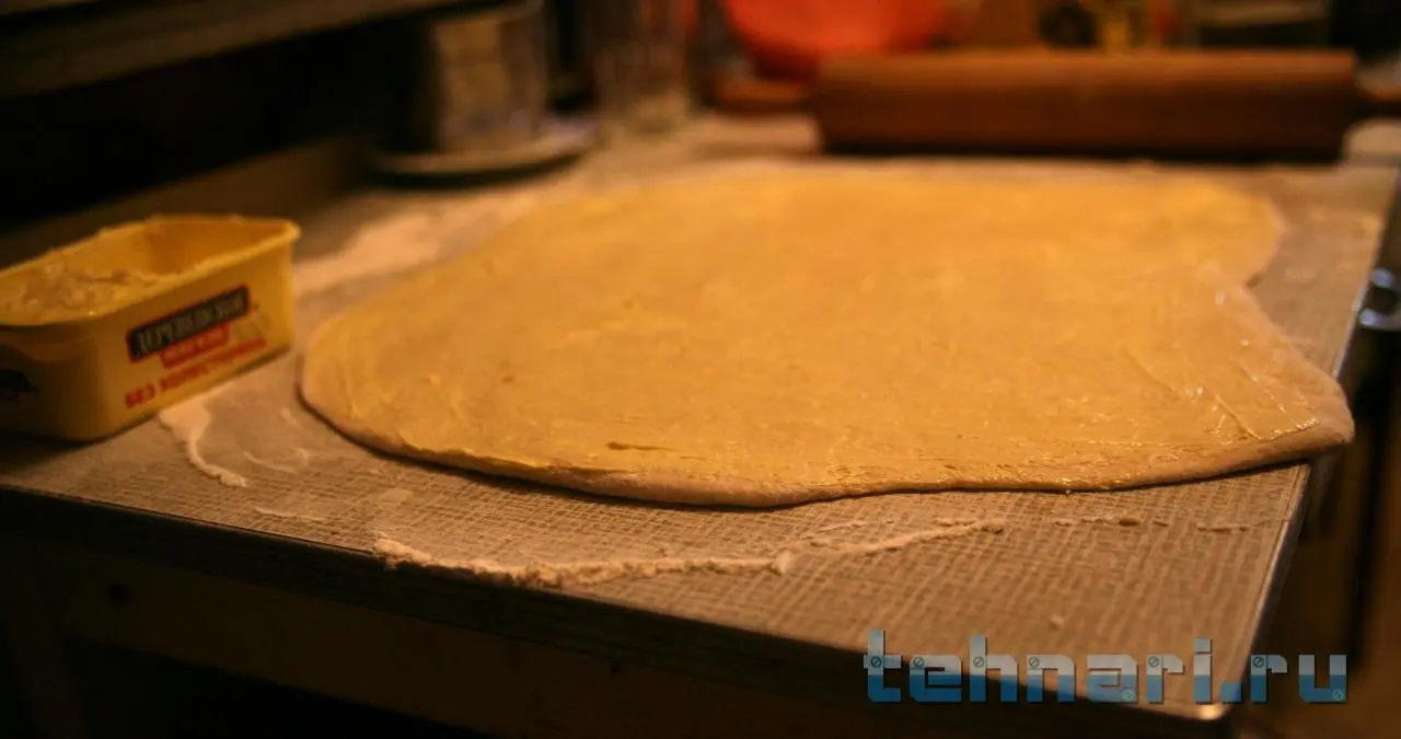 Теперь раскатанное тесто нужно промазать слоем масла или маргарина. У кого что есть.