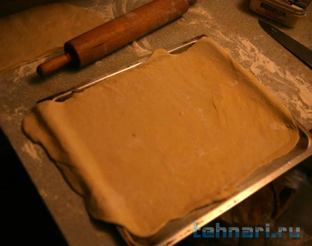Перенос осуществляется путем заворачивания теста на скалку и переноса его на смазанную протвинь.