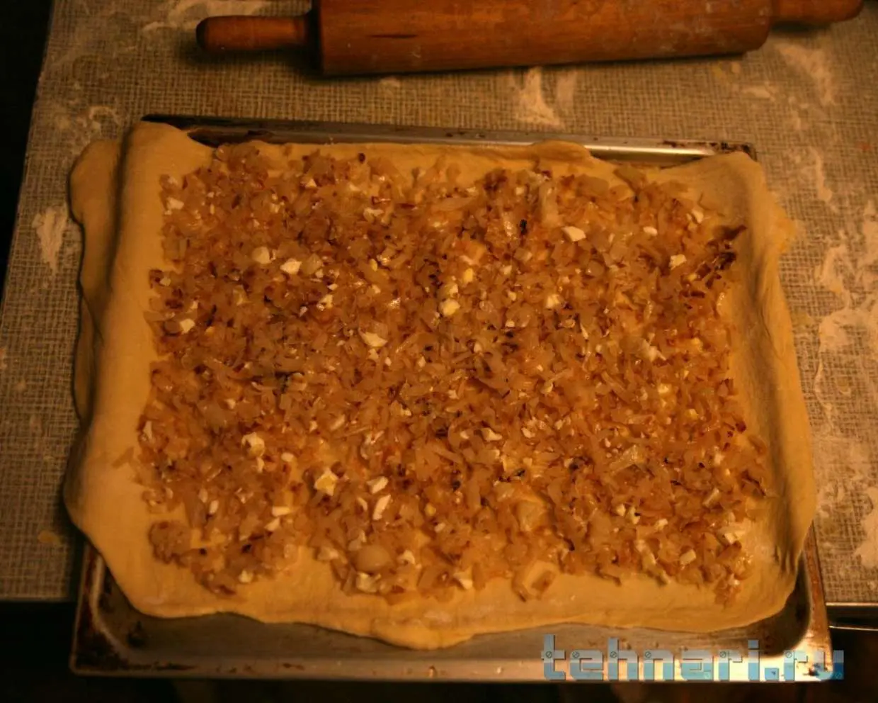 Варим 1-2 яйца, шинкуем в капусту, добавляем туда лук. Вываливаем на тесто в протвине, размазываем равномерно.