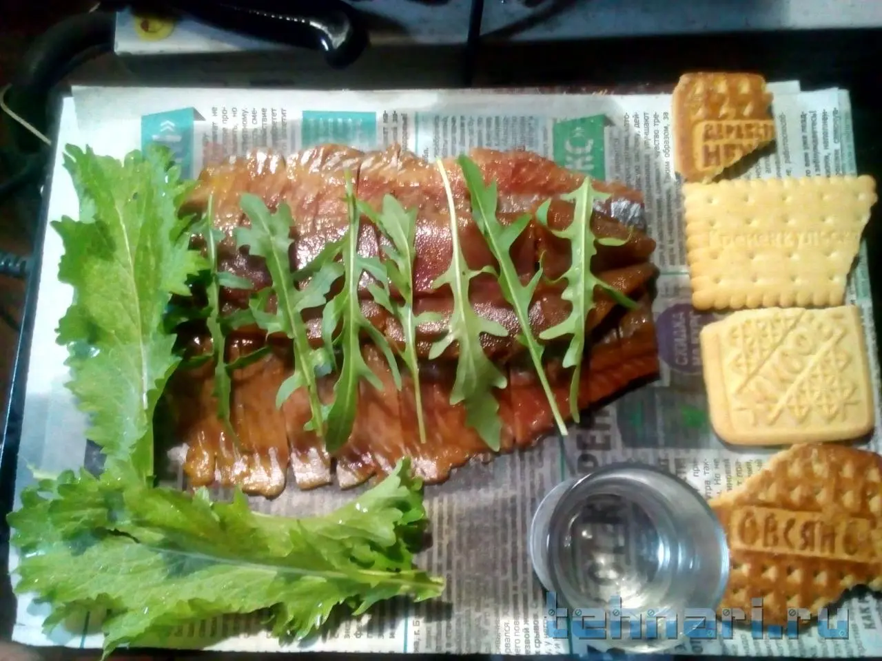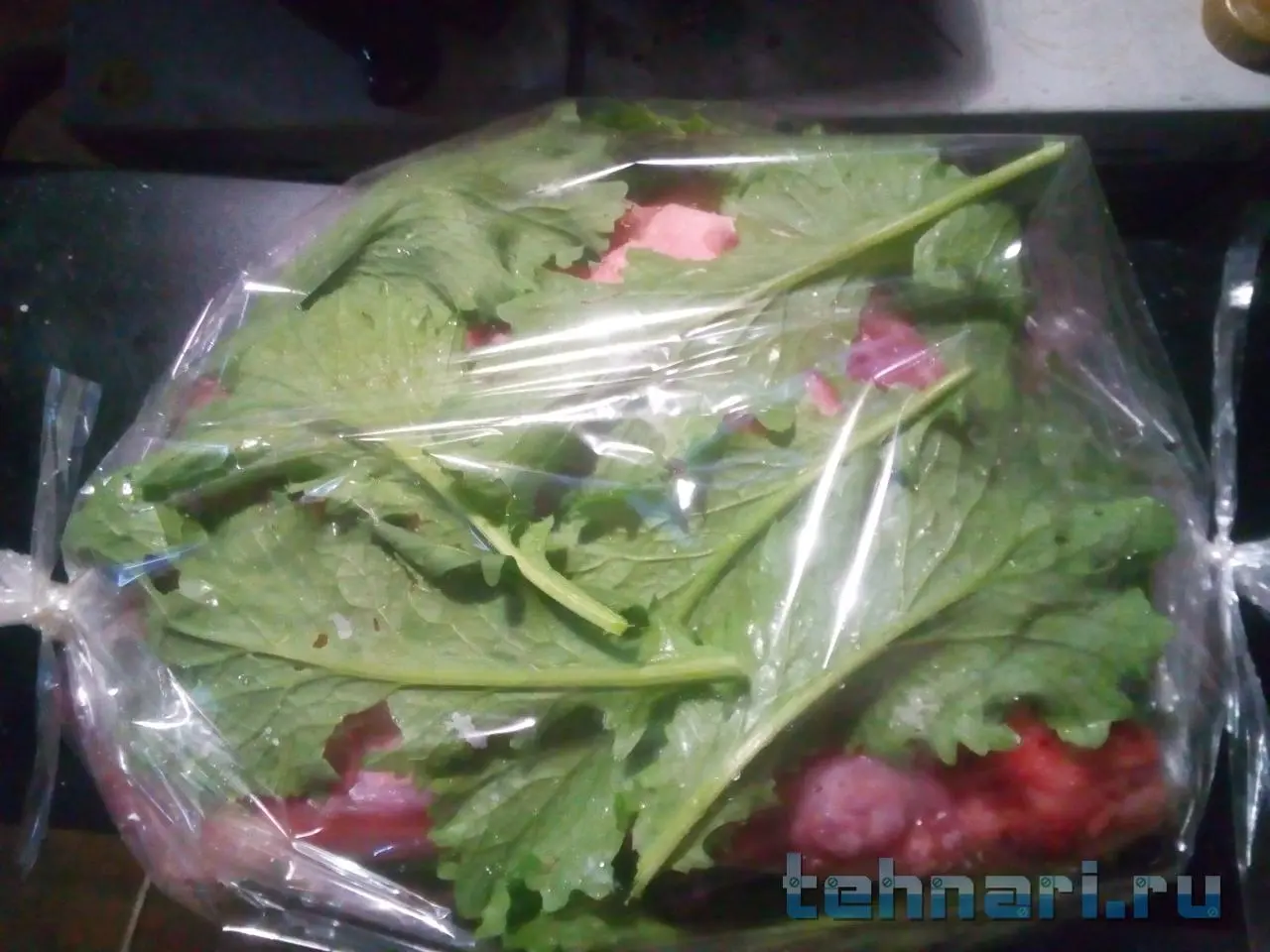 Для тех, кто не в танке: листики создают влажность и дают мягкую шкурку и мягкую поверхность куска. В данный момент под руку подвернулась листовая горчица. Зимой, не заморачиваясь, кладу вперемешку картошку с луком. Сразу и гарнир готов. Соль и прочие дряности - по вкусу и настроению.