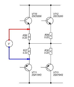 Ток покоя выставляеться подстроечником R22, Ток покоя можно узнать, измерив падение напряжения на паре эмиттерных резисторов,