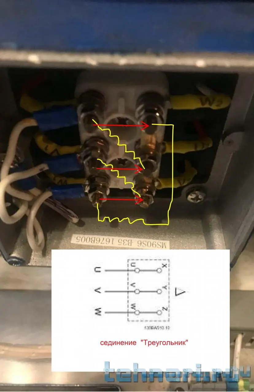 Это средняя точка звезды. Нужно снять её и отзвонить обмотки - их начала у Вас уже подключены к фазам. Теперь нужно будет конец первой соединить перемычкой с началом второй, конец второй с началом третьей, а конец третьей с началом первой. Это будет треугольник. ...