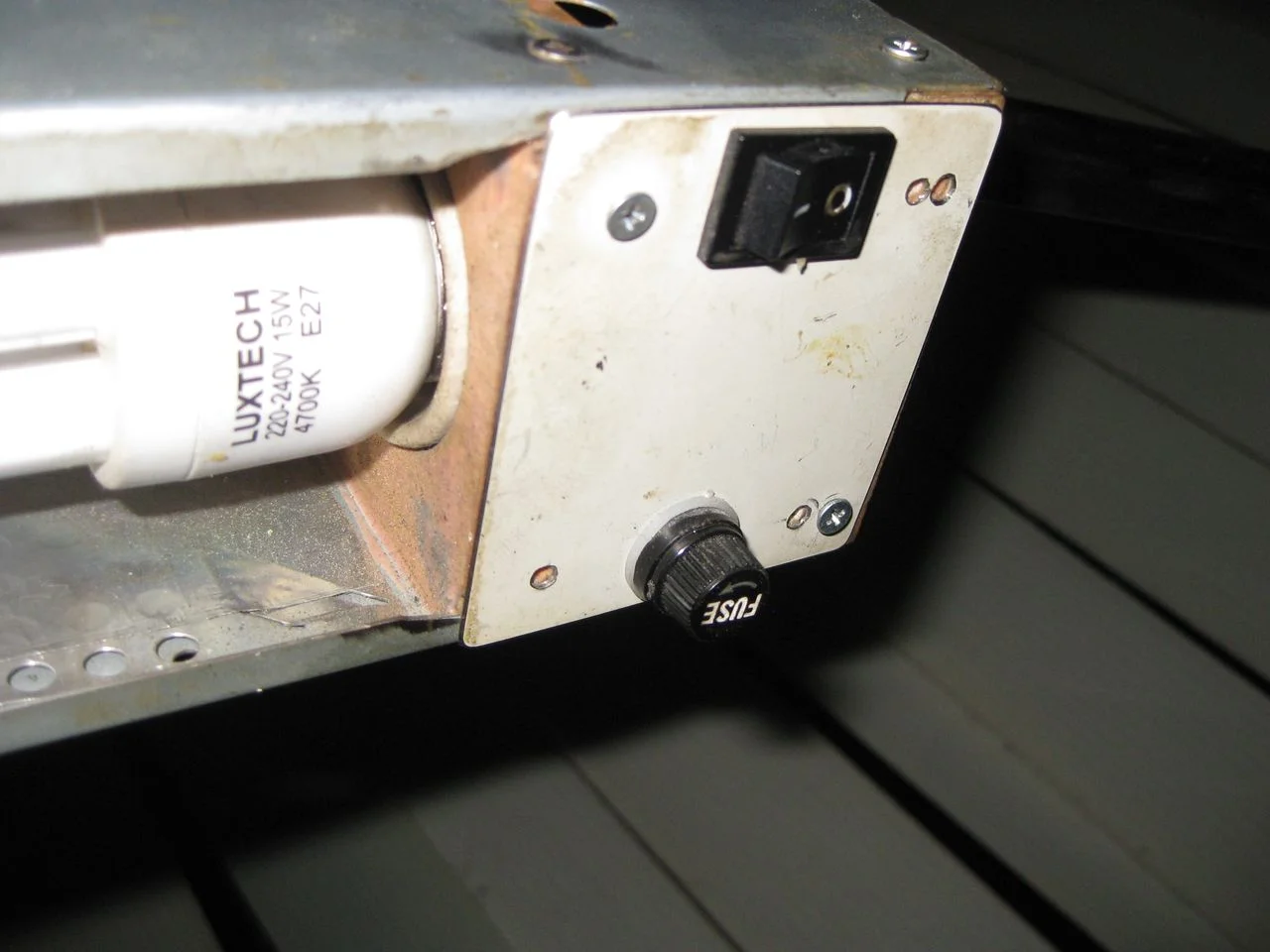 Схема абсолютно "не секретная", плавкий предохранитель действительно устанавливается в разрыв одного из проводов питания (как уже сообщил ув. Weles). Совершенно забыл, что я его ставил в рабочий светильник (перед носом находится):