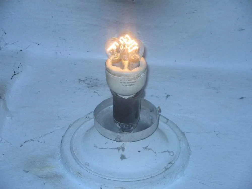 Лампочки 110 вольт 8 ватт, соединены последовательно, кратковременно выдерживают даже 380, то есть обрыв группового нуля им не страшен и на лестничной клетке горят вечно. Закрепил в корпусе от дохлой экономичной лампочки монтажной пеной.