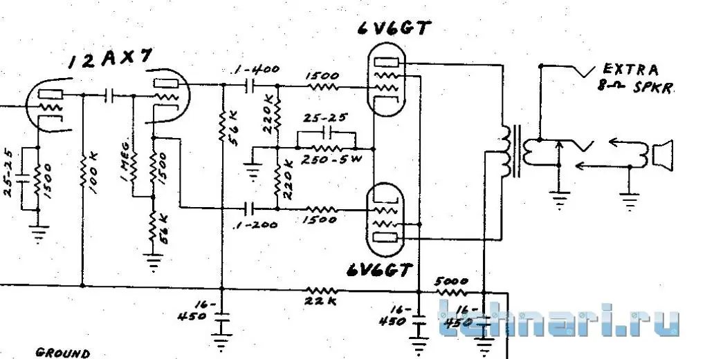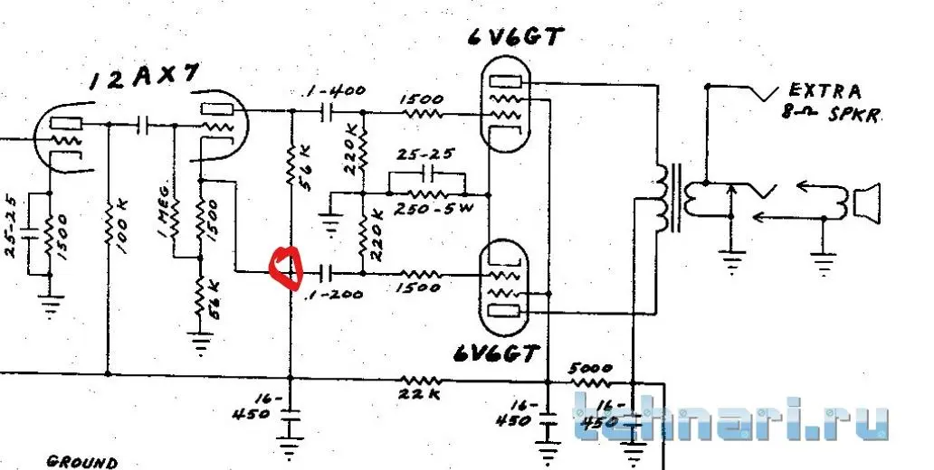 Ну вот собственно, еще одна схема выходника на октальных лампах. Это от фендера кусок схемы. Помогите, пожалуйста, разобраться - откуда начинается вазоинвертор?