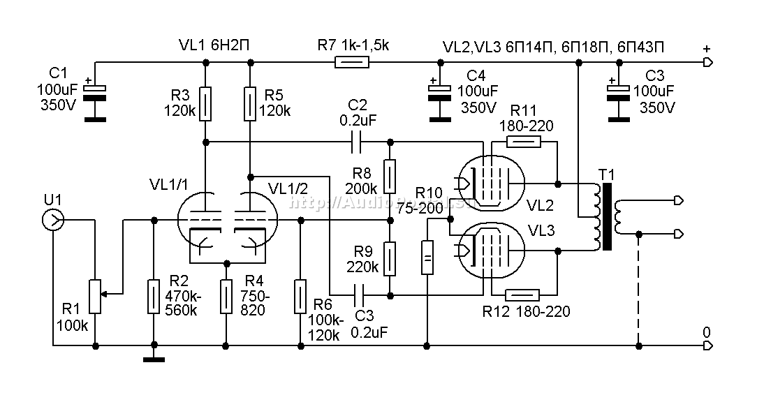 Напряжение около 400 В. На входе собран фазоинверсный каскад, в оригинале на ЕСС88 (6Н23П). На выходе двухтактный каскад (пушпул) на EL84 (6П14П)