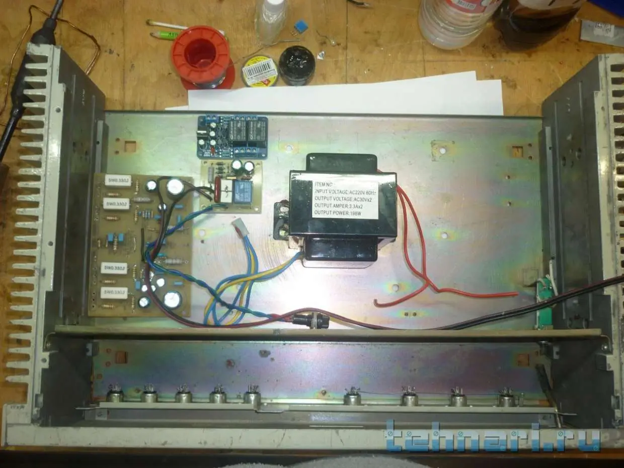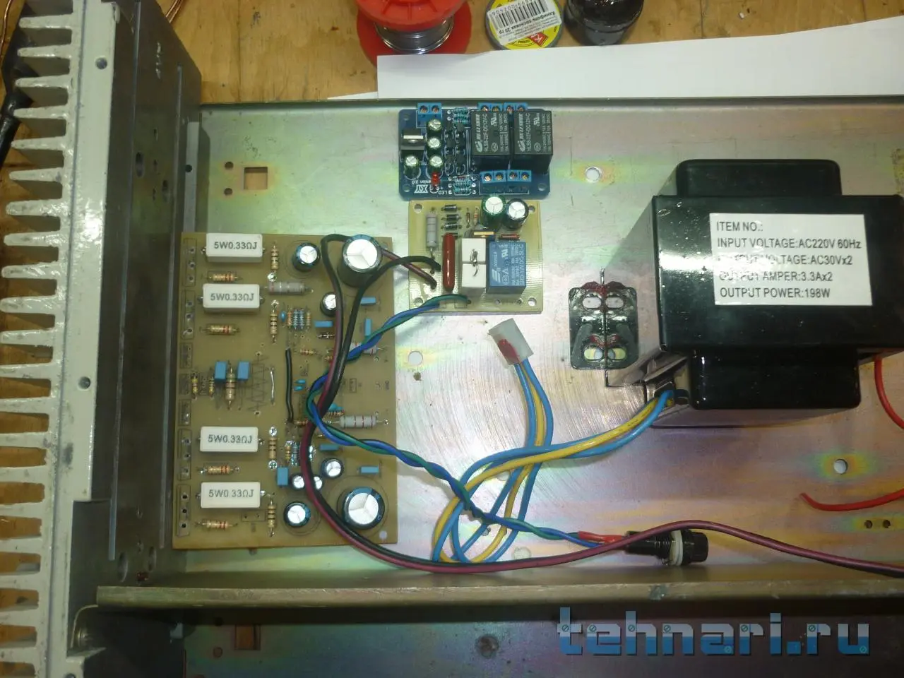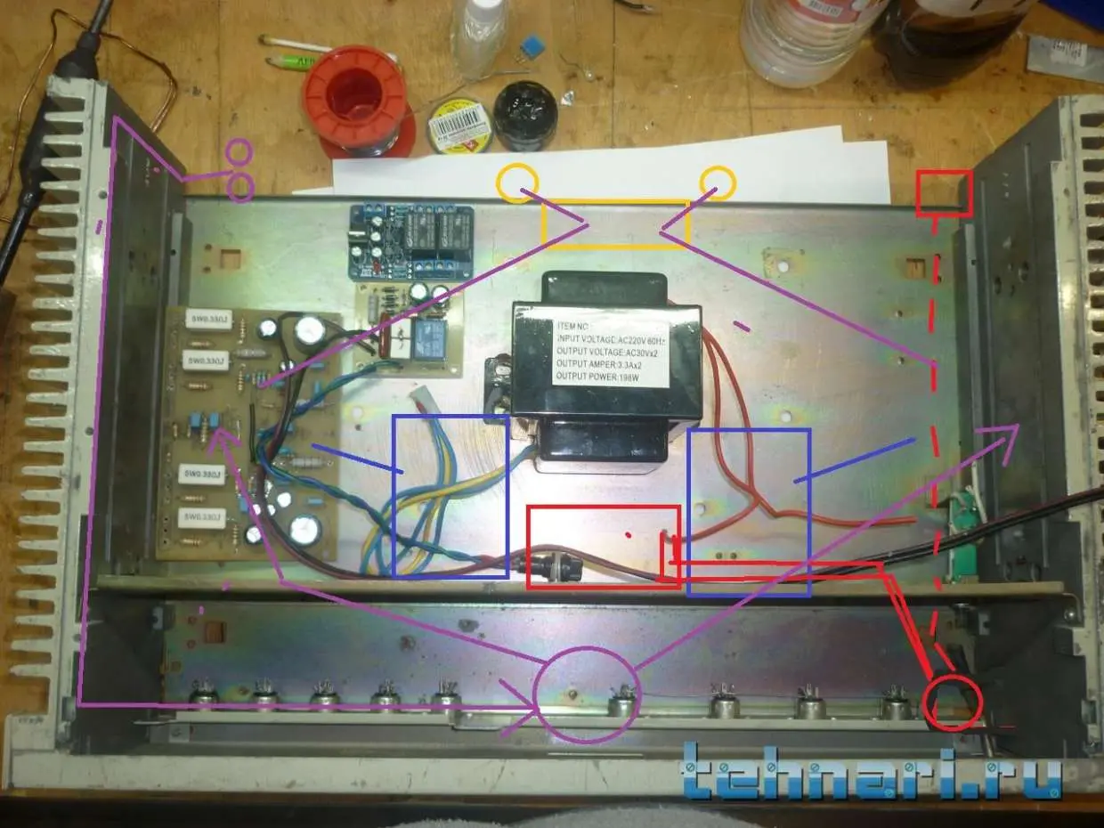 Компоновочку можно и пересмотреть. Все сигнальные(звуковые)цепи- подальше от питающих, ни когда ни параллельно, пусть иногда пересекаются. Платы сервиса можно разместить и " стоя" - высота корпуса позволяет. Так, для примерки:ЖЕЛТЫЙ плата защиты крепится на заднюю стенку, СИНИЕ -выпрямители, красный вход 220(провод можно пустить под днищем(пунктир) кнопка ВКЛ на передней панели и к красному прямоугольнику софтстарта(хотя его можно и рядом с кнопкой в "кармане " у передней панели) . Тогда на место между выпрямителей - второй трансик на защиту(подсветку там, пред и проч мелочь). Фиолетовый - вход сигнала, РГ.