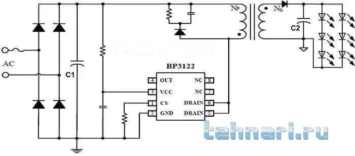Стабилизация тока через светодиоды реализована без оптопары, цепи обратной связи на TL431 и вспомогательной обмотки трансформатора. Вместе с тем минимизировано количество внешних компонентов. Пусковой ток составляет 60 мкА . Конденсатор в цепи питания VCC заряжается через пусковой резистор при включении. Как только напряжение VCC достигнет пускового порога, BP3122 начнет вырабатывать импульсы. Напряжение питания микросхемы стабилизирует внутренний стабилизатор на 15V. Сверхнизкий ток потребления микросхемы не требует наличия вспомогательной обмотки на трансформаторе для питания микросхемы.