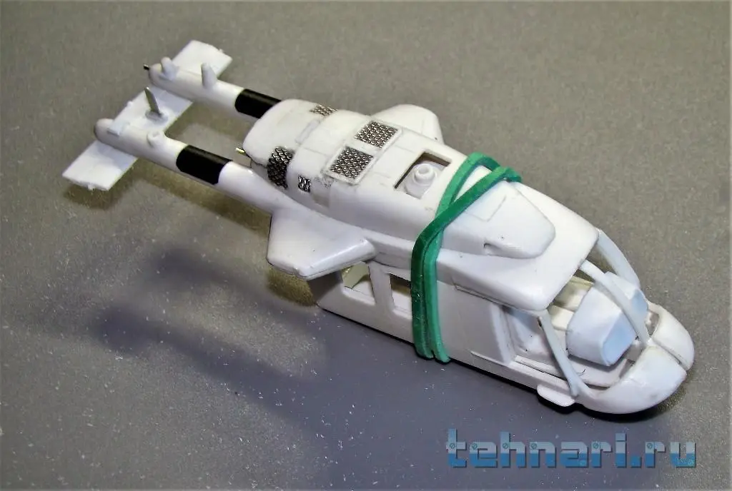 Сборку начинаю с крыши вертолета. Вычленяю детали, удаляю облой и произвожу склейку согласно инструкции по сборке. По инструкции в кожух должны вклеиваться выхлопные патрубки двигателей, но в модификации Ка-226Т они выглядят совсем иначе, чем в модели, представленной в коробке. Поэтому берем в руки нож и напильник и начинаем приводить модель в соответствие с фото реальной машины. Для начала прорезаются более большие окна в крышке капота и напильником прорезается паз в крыше, а также сверлом сверлятся отверстия под выхлопные трубы двигателей.