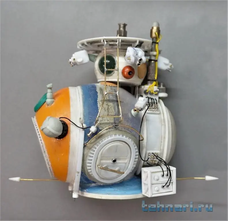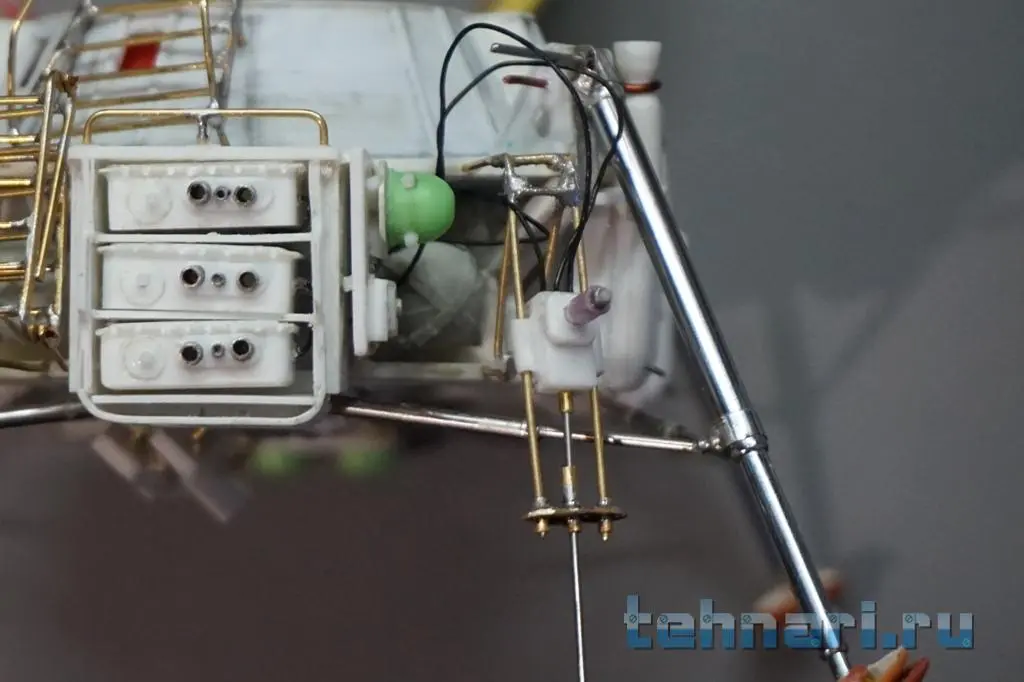 А далее работа продолжается над заполнением внешней поверхности кабины космонавта, лежащей на обратной стороне от выходного люка. А здесь сосредоточены элементы стыковочного узла кабель-мачты, соединяющей взлетную ступень с посадочной, а также узел приборов, отвечающих за газо- водораспределение на ЛК