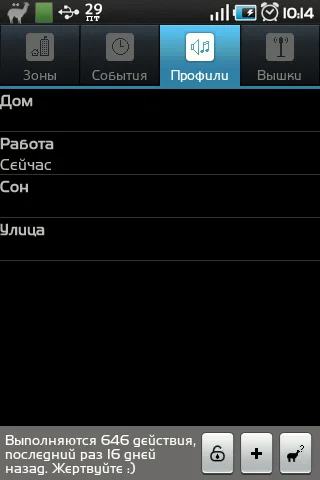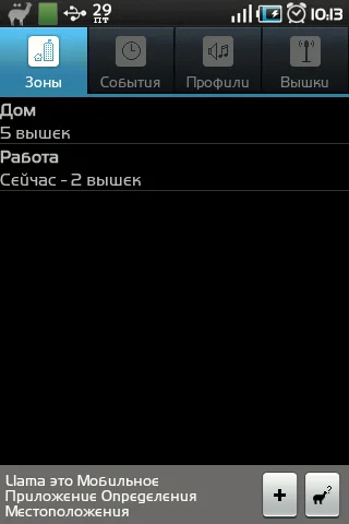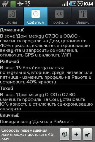 Llama - Location Profiles одно из самых удобных и не требовательных приложений, которые работают с профилями по местоположению, относительно антенн оператора на карте, координаты вы задаете сами. Например если вы дома и время от 00.00 до 6.00, то громкость тихая, если вы в дороге с 7.00 до 8.00 - звук средний, если вы покинули установленную область - звук громкий. Так же приложение может включать/выключать Bluetooth, интернет, моб. связь, закрывать приложения и перезагружаться.