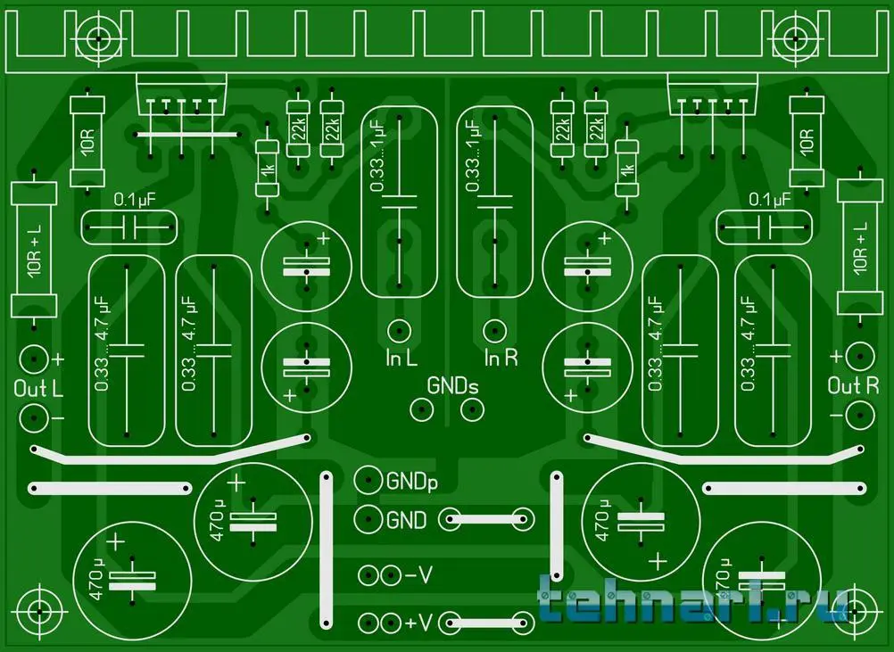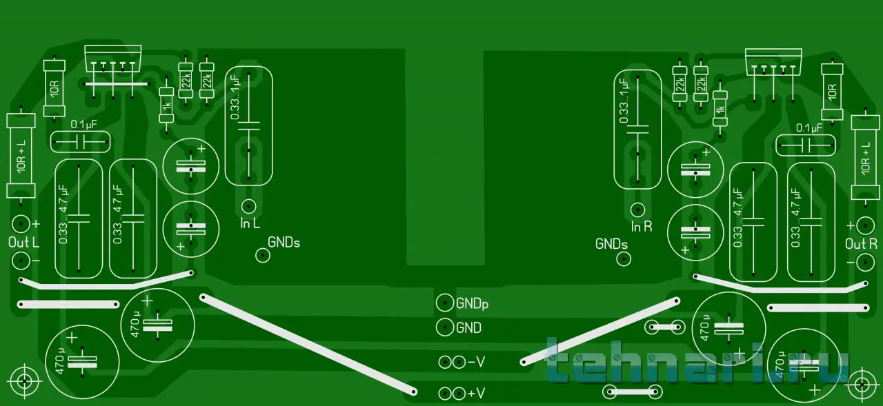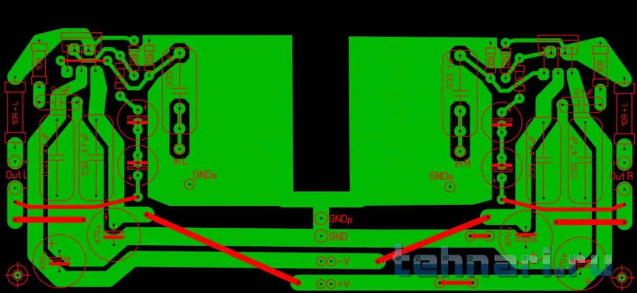 В исходной плате земля разведена по принципу звезды, что минимизирует наводки и исключает земляные петли. К тому же плата составлена под комплекс полного усилителя. Реализовано в "железе". Все заложенные в плату принципы в "железе" полностью подтвердились. Ну кто хочет охать и ахать, имеет полное право.