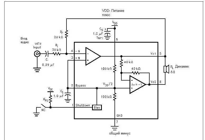 вот есть микруха LM4871 а как подключить её не знаю там 5 входов и как из этого всё собрать это вроде уселитель для телефонных колонок
