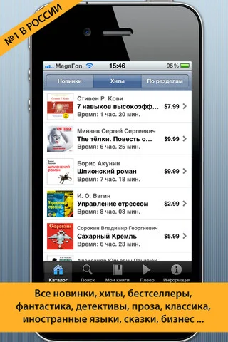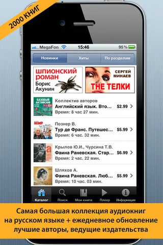 - большой выбор бесплатных аудиокниг с ежедневным пополнением;