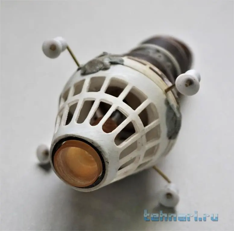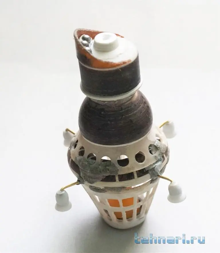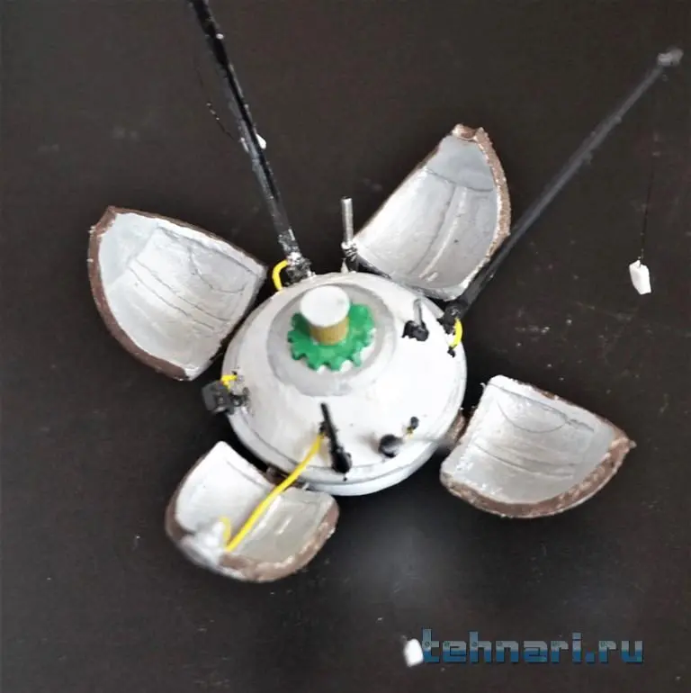 Работа началась с изготовления лунной станции "Луна-9". Найденные чертежи переведены в М1/24, подобран шарик Ф25мм для корпуса станции. Для данной цели подошел шарик от дезодоранта. Поскольку корпус станции имеет не совсем полную форму шара, то по произведенной разметке шарик разрезан, на две неравные части , а затем заново склеен через центральный дискообразный вкладыш. Из второго шарика вырезаны лепестки антенн станции, после чего все было собрано в одну конструкцию на "липучку".