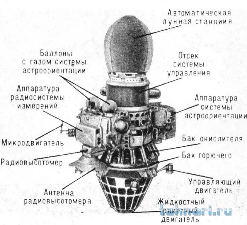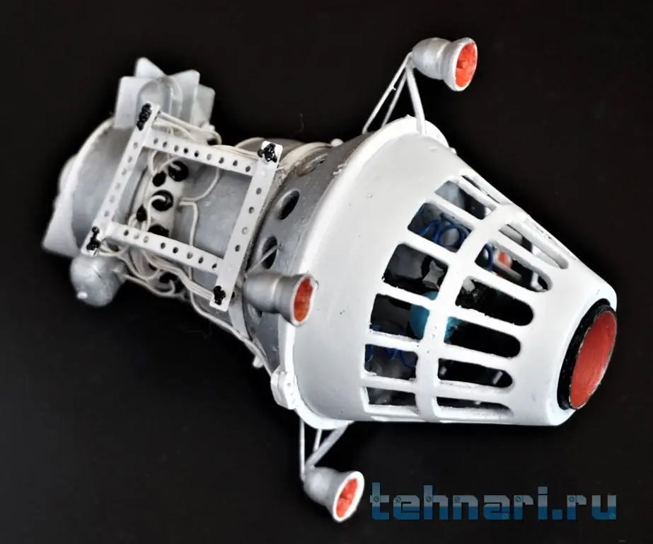 Первый этап закончен, вторым этапом пошла сборка перелетного модуля станции. Но прежде чем взять в руки инструменты и пластик, пришлось проработать ряд материалов, связанных с данным проектом. Особую помощь в этом деле оказала монография Павла Шубина, описывающая все ньюансы данного проекта, все дополнения и изменения, вносимые в конструкцию станции в ходе работы над результатами неудачных запусков. А ведь станция "Луна- 9" была 13 по счету из числа станций, предназначенных для мягкой посадки на Луну. 12 станций остались на орбите ИСЗ, пролетели мимо Луны, врезались в Луну. И самое главное, что в монографии присутствовали чертежи некоторых вариантов станции, что очень помогло в работе. Перед прилунением АМС с помощью системы астроориентации ориентировалась соплом двигателя по лунной вертикали, данные координаты заносились в блок управления, после чего производился сброс со станции уже не нужных для дальнейшей работы двух отделяемых отсеков: №1 с системой астроориентации и №2 с радиоаппаратурой. После чего включался основной двигатель и 4 двигателя малой тяги. Аппарат получал тормозной импульс и сходил с орбиты. После выключения основного двигателя управляемый спуск продолжался при помощи двигателей малой тяги, которые отключались в момент соприкосновения с поверхностью Луны двух четырехметровых ленточных щупов с концевыми выключателями. Одновременно с выключением двигателей производился наддув баллонов амортизатора станции и отстрел корпуса станции от перелетного блока. Чтобы корпус станции не прилунился после отстрела на перелетный блок на месте крепления амортизатора был установлен своеобразный воротник, задающий направление движения амортизатора со станцией вверх и в сторону. После отделения амортизатор делал 2-3 прыжка и устанавливался на поверхности Луны. Затем производился подрыв пирошнура, скреплявшего две половинки амортизатора, которые под действием собственной деформации разлетались на приличное расстояние от корпуса станции, плавно опустившегося на поверхность Луны. По команде программного устройства раскрывались 4 антенных лепестка, распускались ленточные антенны, запускался телефотометр и начинался сеанс телевизионного вещания с поверхности Луны.