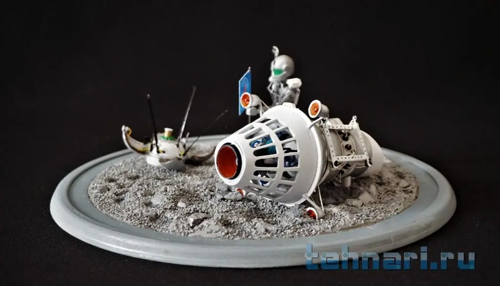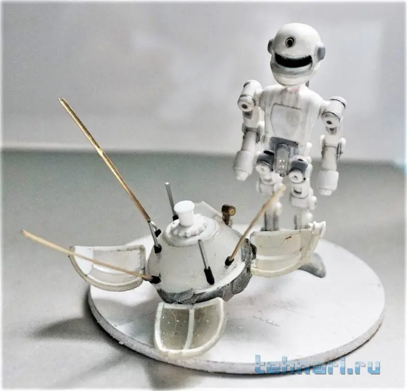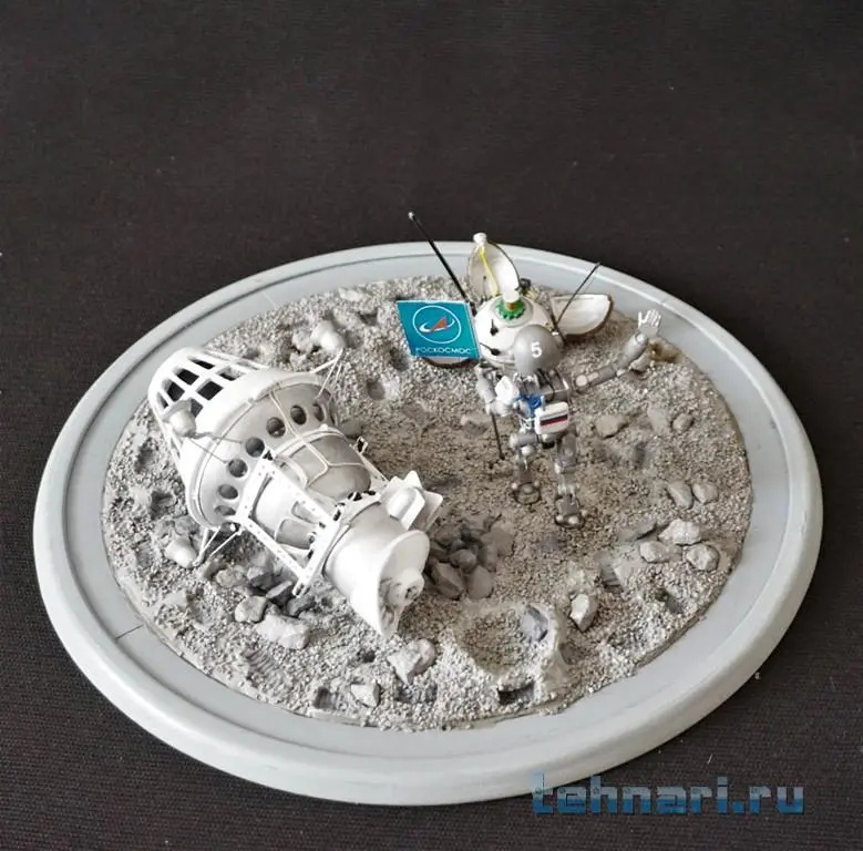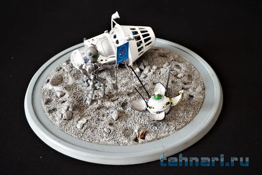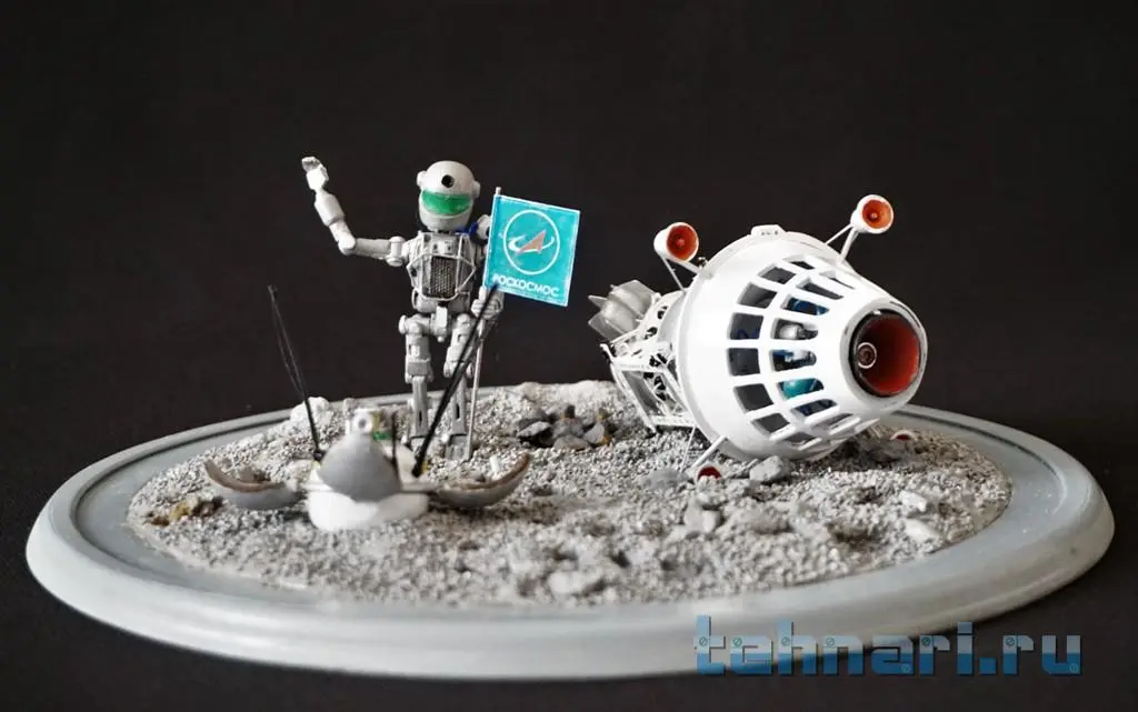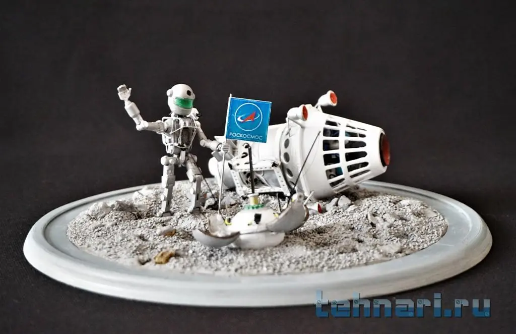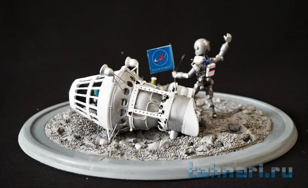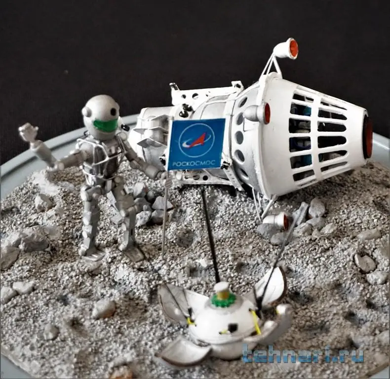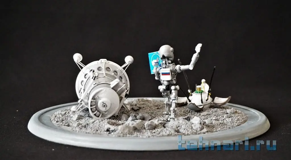 Для сборки воедино всех элементов композиции из листового пластика было вырезано и склеено основание в фроме круга, на котором при помощи твердого скульптурного пластилина была оформлена основа лунной поверхности, на которую были добавлены гравийные камешки и вся поверхность засыпана прогретой в духовке пищевой солью, имитирующей мелкий лунный щебень и пыль. Это позволило отказаться от промазки поверхности клеем для закрепления на ней частиц соли. Разогретые крупинки соли прочно впаялись в пластилин, излишки соли были удалены простым стряхиванием. После данной процедуры и отверждения поверхностного слоя пластилина, подвергнутого атаке горячей солью,основание было закрашено с помощью аэрографа в разные оттенки серого цвета. А уже затем на основание на штифтах были размещены АМС "Луна-9", перелетный модуль, робот ФЕДОР-2, которому в руки был вставлен флагшток с символикой РОСКОСМОСА. Данную композицию вы можете лицезреть на прилагаемых снимках.