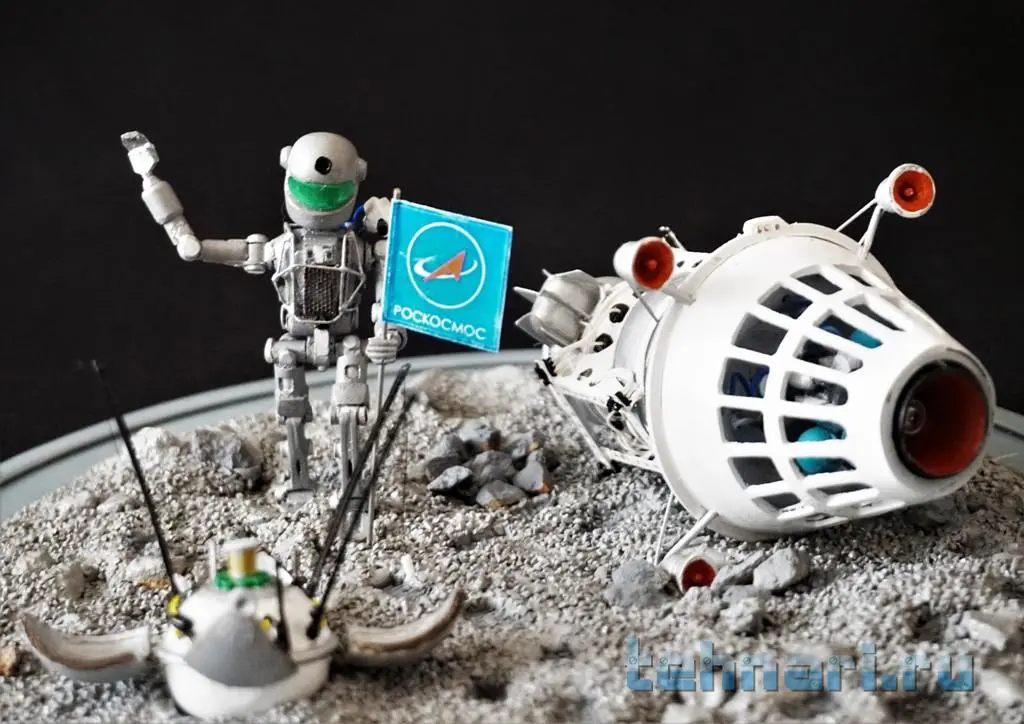 Основой для данной виньетки послужили картины советских художников, на которых показаны моменты прилунения АМС "Луна-9" и перелетного блока станции, а также картина посещения места прилунения станции советским космонавтом. В работе космонавт заменен на робота, но уже российского. Вот такая канва событий...