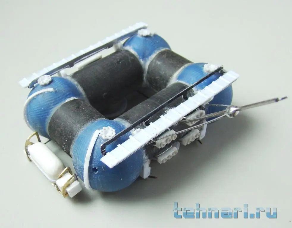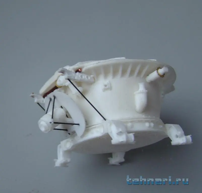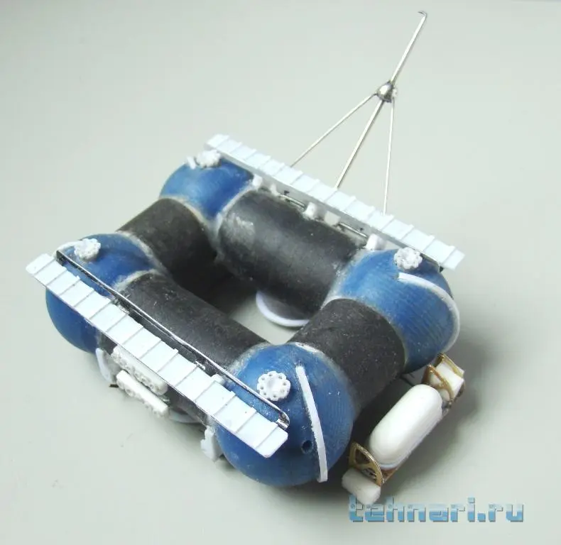 После чего на корпус клеятся корпуса четырех телефотометров. При этом, на "Луноходе-2" в отличие от "Лунохода-1"был установлен новый прибор, определяющий положение аппарата относительно вертикальной оси (т.е. наклон в любую сторону), что повлекло за собой изъятие из комплекта датчиков старого типа. А они представляли из себя сферическую чашку с нанесенными концентрическими рисками. Внутри чашки свободно перемещался шарик и по его положению относительно рисок можно было определить угол наклона аппарата. А картинка данных двух чашек(по обеим сторонам "Лунохода-1)передавалась на Землю при помощи горизонтально установленных телефотометров. Крепление данных датчиков на модели "Луноход-1" производилось при помощи фигурной детали из фотоэчета, которая одновременно являлась и элементом конструкции горизонтального телефотометра. Вот эту фигурную зубчатую накладку и пришлось вырезать из представленной в наборе детали и установить при помощи клея на телефотометр. А заодно установить на корпус еще пару приборных блоков.
