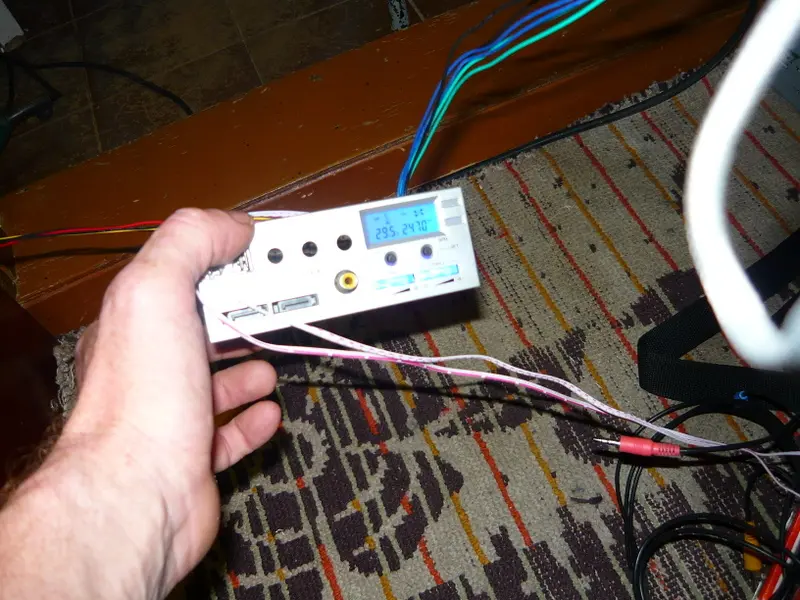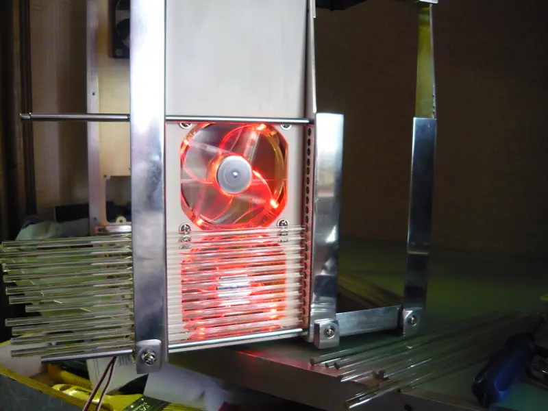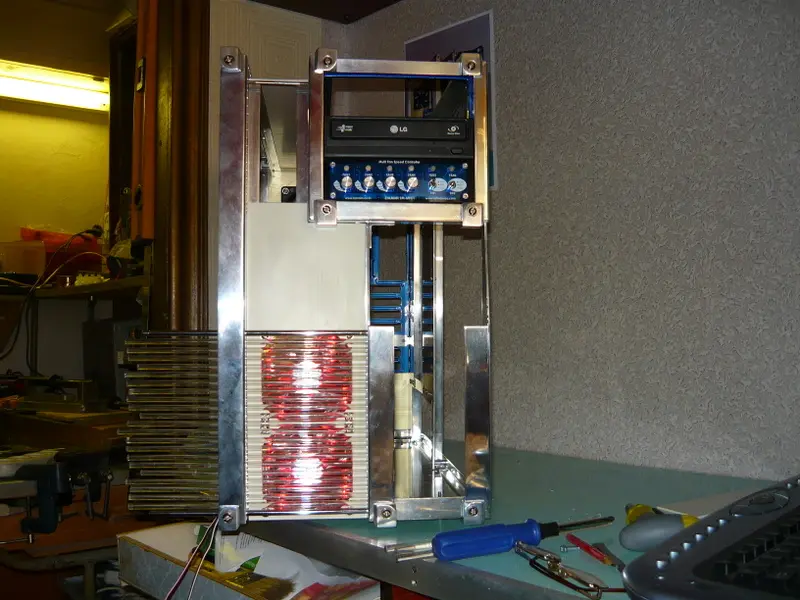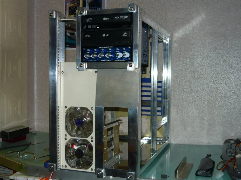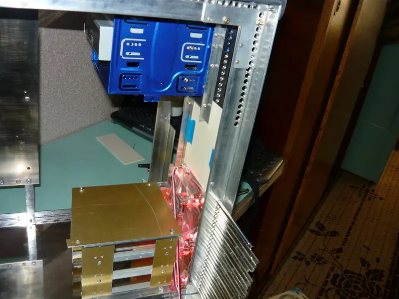 Продолжаю: Начал обшивать каркас, цветного акрила не нашёл хотя предпринимал усилия (у нас везде продают листами). Пришлось обшивать полистиролом, был кусок 500х500 на перёд и верх хватило. Материал слабенький, пришлось делать усиление из алюминия (где вентиляторы на верху).Получилось хорошо да и полистирол глушит шум от вентиляторов. Опробовал вентиляторы и реобас, питание взял с рабочего компа (у меня разъём сзади для питания внешних дисков). С реобасом отдельная история (фоток нет), но я его укоротил и переделал: выкинул картридер, поставил USB по другому.:tehnari_ru_288: