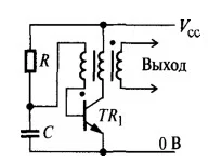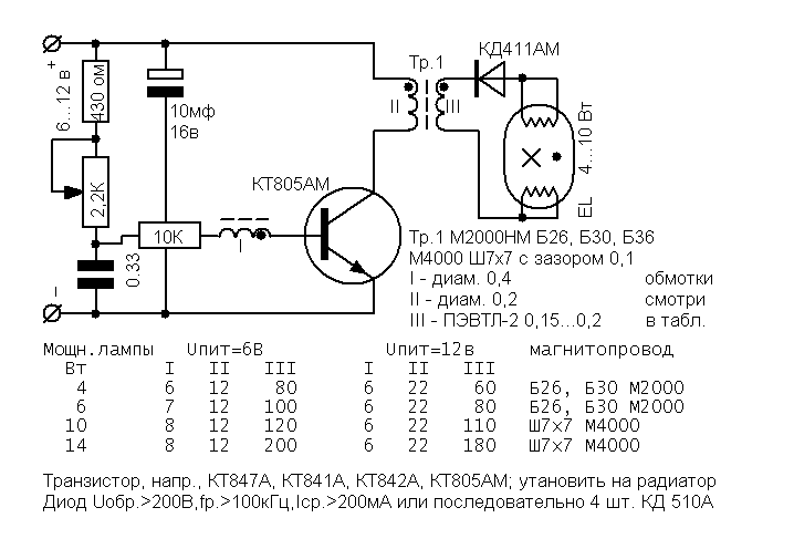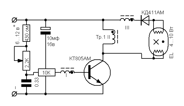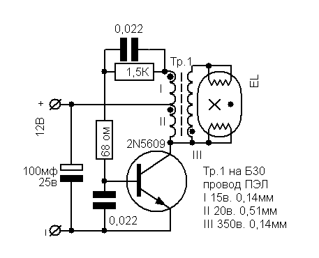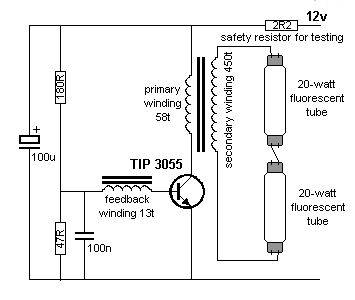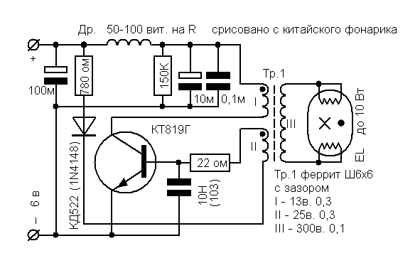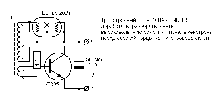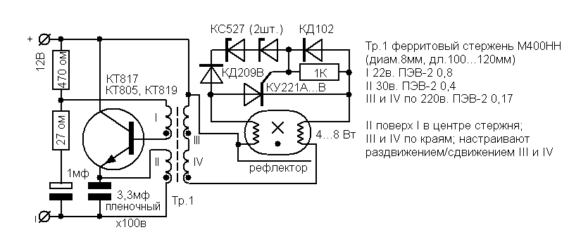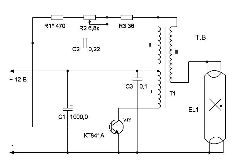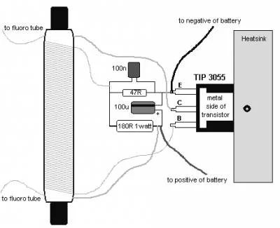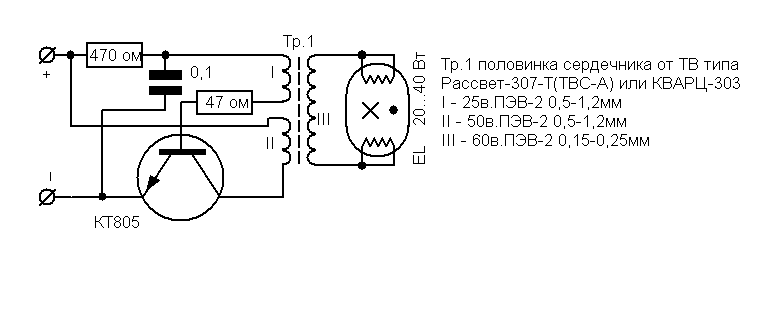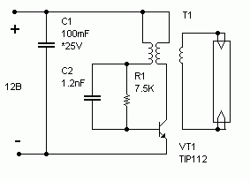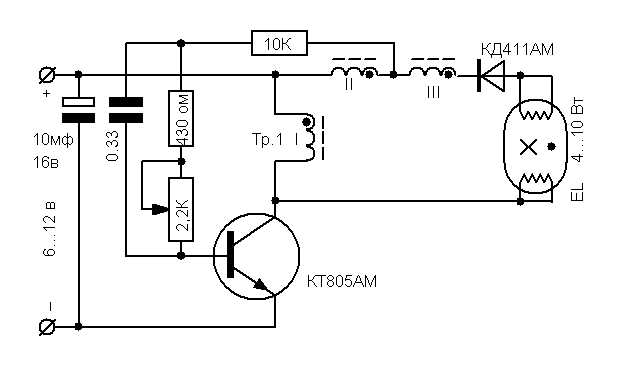 "+" идёт на катушку, с катушки на 1 вывод лампы с 1 стороны, "-" идёт через резистор и также к 1 выводу но на другой стороне уже, 2 оставшихся контакта лампы по бакам, он подключил к кондесатору, который и запускал её
