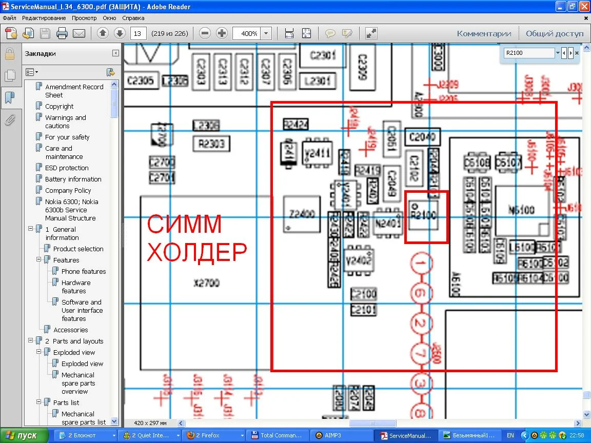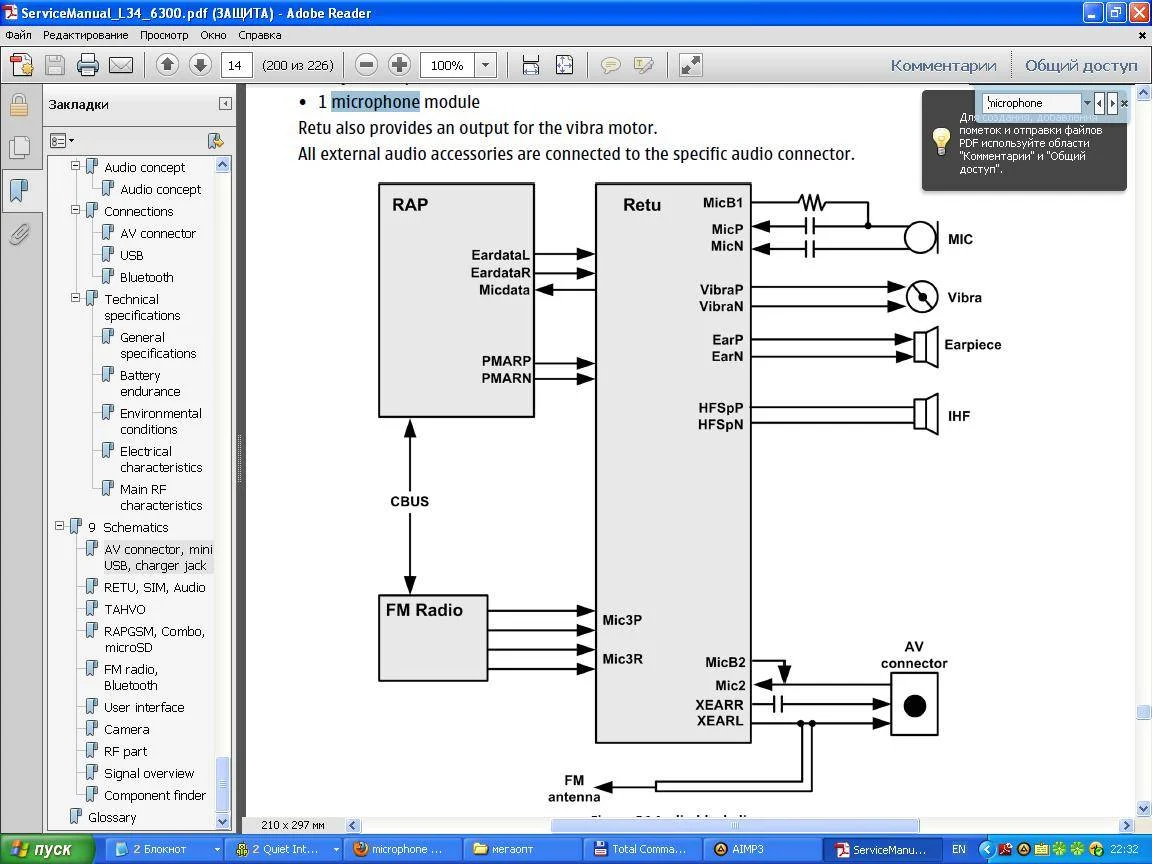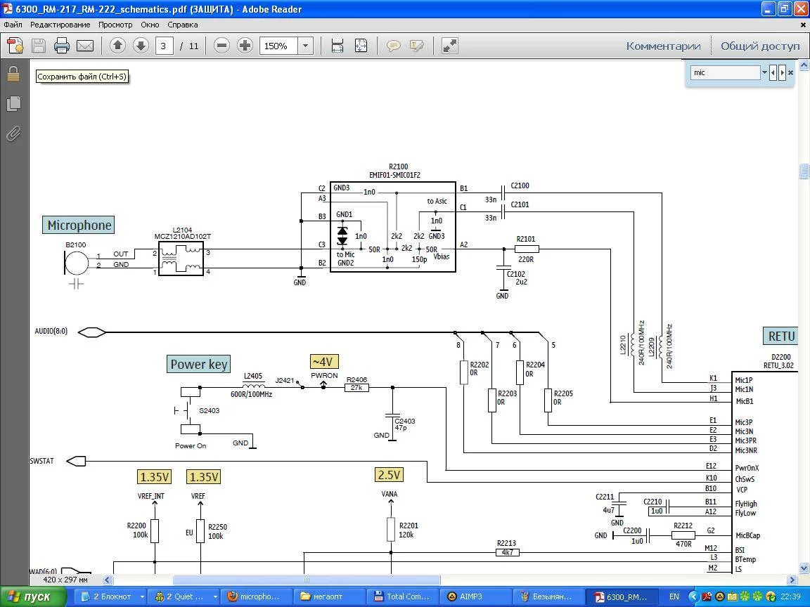 дак видно ж из схемы - с Рету минуя 2 дросселя, 3 конденсатора и 1 резюк - идет на еми фильтр, минуя его через 2в1 дроссель на микрофон., т.е при поврежденном дросселе L2104 1 контакт (gnd) в принципе масса., ну а (out) его нужно выковыривать либо с 3-го пина дросселя, либо брать с С3 контакта ЕМИ фильтра R2100., либо искать дорогу между ЕМИФ и Дросселем Л2104 (не могу сказать где она проходит)., ну и соответсвенно по аналоговой распайке R2100 пока тоже ничего не подскажу (на тот случай если изобретать велосипед)