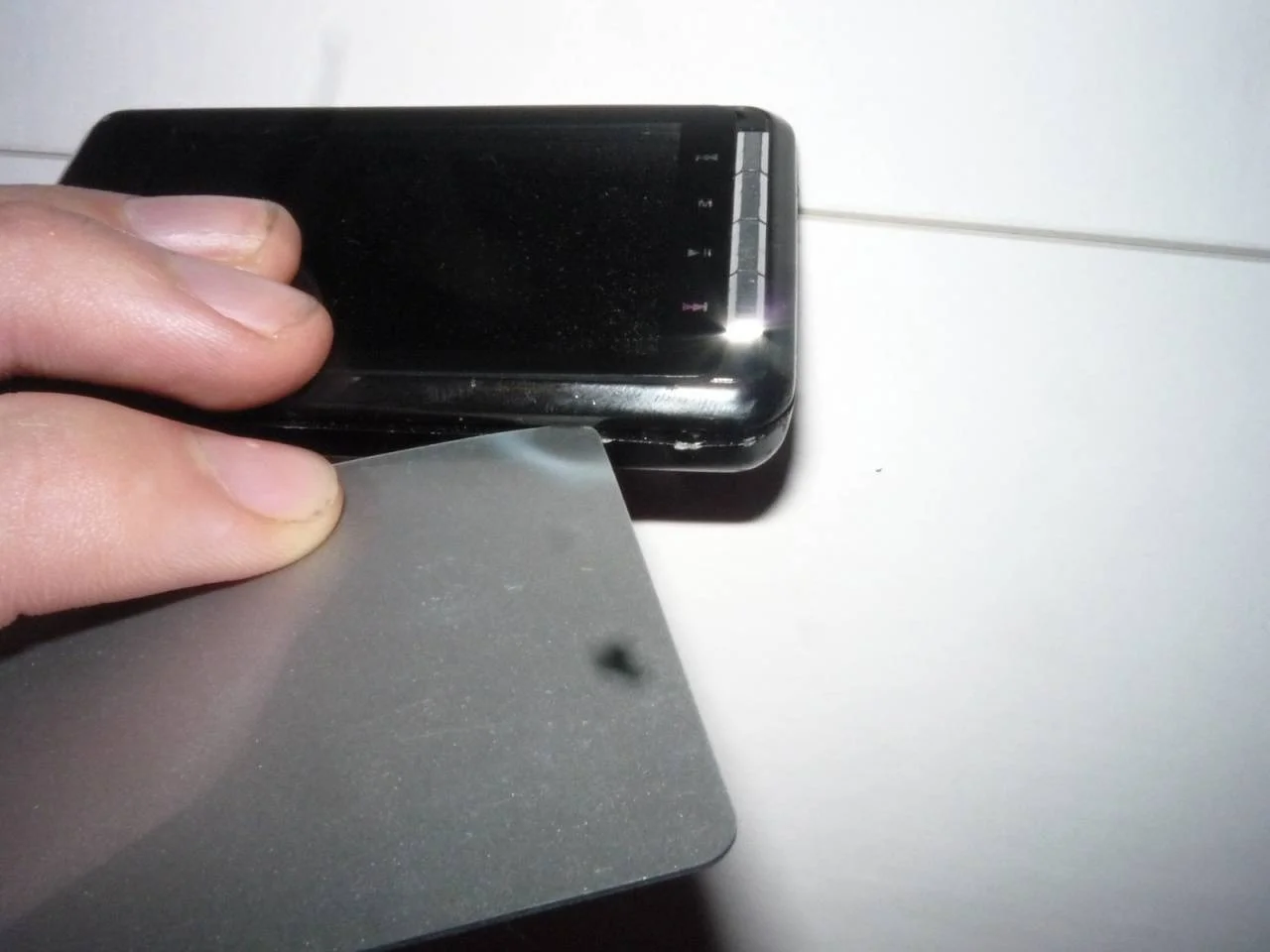 И так, для начала нам нужно разобрать плеер. Для этого я использовал пластиковую карту(она к слову немного помялась - брать только ненужные! ). Аккуратно поддев с одного краю, можно вести, а можно просто подсовывая в местах защелок(если знаете где они), снимаем крышку и делим плеер пополам.