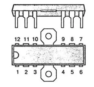 смотрите на микросхему сверху, первая ножка начинается слева направо нижнего ряда, 1-7 ножки, в верхнем ряду справа налево 8-14 ножки, вообщем против часовой стрелки от ключа на микросхеме.
