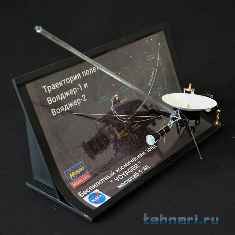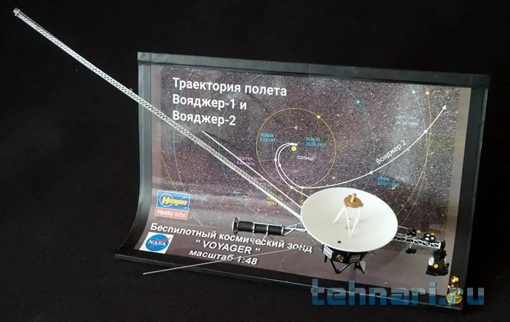 Пока суть, да дело с поиском решения по решетчатым балкам, отказался от изкоробочной подставки,как довольно неустойчивой конструкции, а взамен ее вырезал и склеил из листа оргстекла новую устойчивую подставку, на которой разместил найденный в интернете рисунок с траекториями и хронологией полета амс "Вояджер-1" и амс "Вояджер-2".